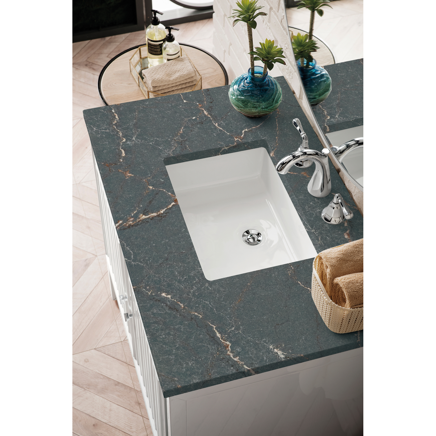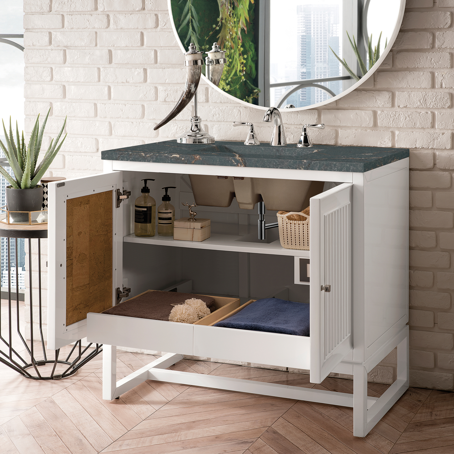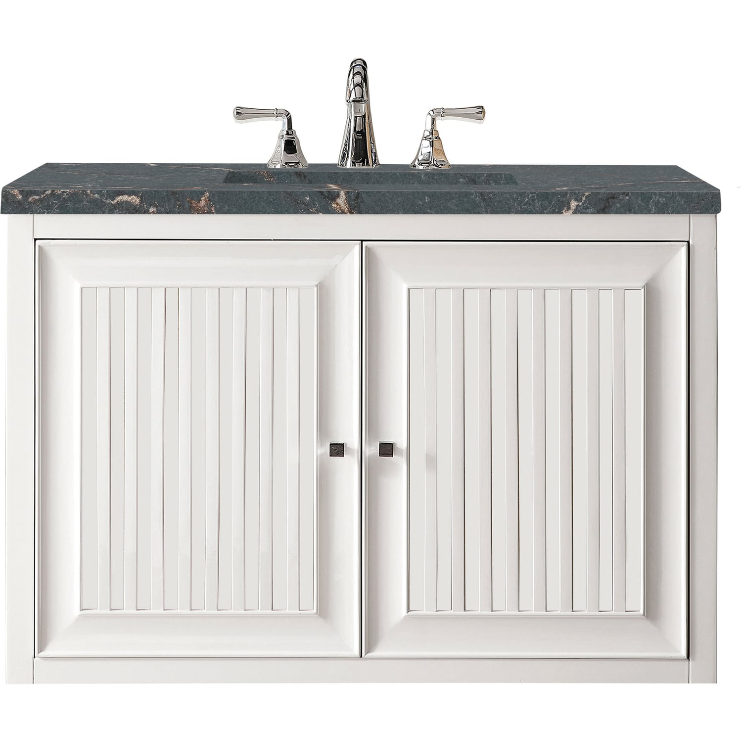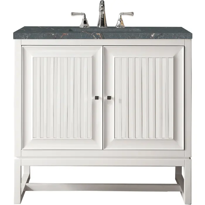 Customize your space with the Athens 36” Glossy White Single Vanity by James Martin Vanities. Part of the larger Athens modular collection, this incredible Vanity boasts an impressive amount of storage space and combines traditional charm with modern functionality. Premium standard features include soft-close undermount drawer glides and adjustable door hinges, brushed aluminum laminate drawer bottoms, and one bamboo drawer organizer. The Bright White finish is enhanced by the Parisien Bleu Silestone top, offering a deep bluish hue with broad and intricate neutral veins highlighted by fine coppery accents.Vanity set includes a 3cm eased edge Parisien Bleu Silestone top, which includes one white porcelain rectangular undermount sink that ships separately, as well as mounting brackets for easy installation. The top is pre-drilled for an 8" widespread faucet.One door Glossy White single vanity with two interior drawers and shelf spaceCrafted from Poplar solids and plywood and is sealed inside and outside with our premium moisture and UV resistant coatingDrawer boxes are constructed using English Dovetail joinery, feature soft-close undermount glides and a Brushed Aluminum laminate drawer bottom.Polished Chrome hardwareIncludes one removable Bamboo drawer organizer trayThis cabinet may be installed with the wood base as a free standing vanity or mounted to the wall as a floating vanity. All mounting hardware is included.Includes a 120 UL-rated electrical component with dual power outlets and USB (Type A) portsFaucet sold separatelyCountertop is pre-drilled for one 3-hole 8" spreadMake an elegant focal point in your bathroom with the Athens Collection by James Martin Vanities. This durably crafted solid wood collection features tons of roomy storage options behind its sleek modern design. Constructed by expert craftsmen, this collection incorporates a wide variety of different pieces to address your every need. Its beautiful raised panel doors come with vertical grooved opening that allows you to either have it’s normal elegant acacia paneling showing through or if you want reverse it and show off the unique cork look in between those grooves giving you a more transitional look. This unique modular vanity collection is comprised of several different size vanities, mirrors, drawer units, tables and cabinets constructed from solid poplar hardwood and completed in either a mid-century acacia or glossy white finish. These pieces can be topped by any one of our eight custom tops giving that perfect look you been looking for. Soft closing doors and drawers provide smooth and quiet operations, while burnished bronzed finished metal hardware provides the perfect finishing touch. Other fine details include white Ceramic sinks with overflow, dovetail joint drawer construction, predrilled holes to accommodate 8 in. widespread faucets, and multi-layer finish on the cabinets provide beauty and durability for years to come.1 year warranty against manufacturer's defects. We will repair or replace any defective product, if the product is defective in material or workmanship at our discretion. No warranty is expressed or implied regarding damages resulting from consumer misuse.