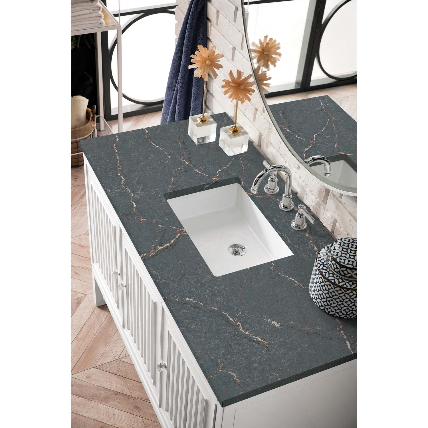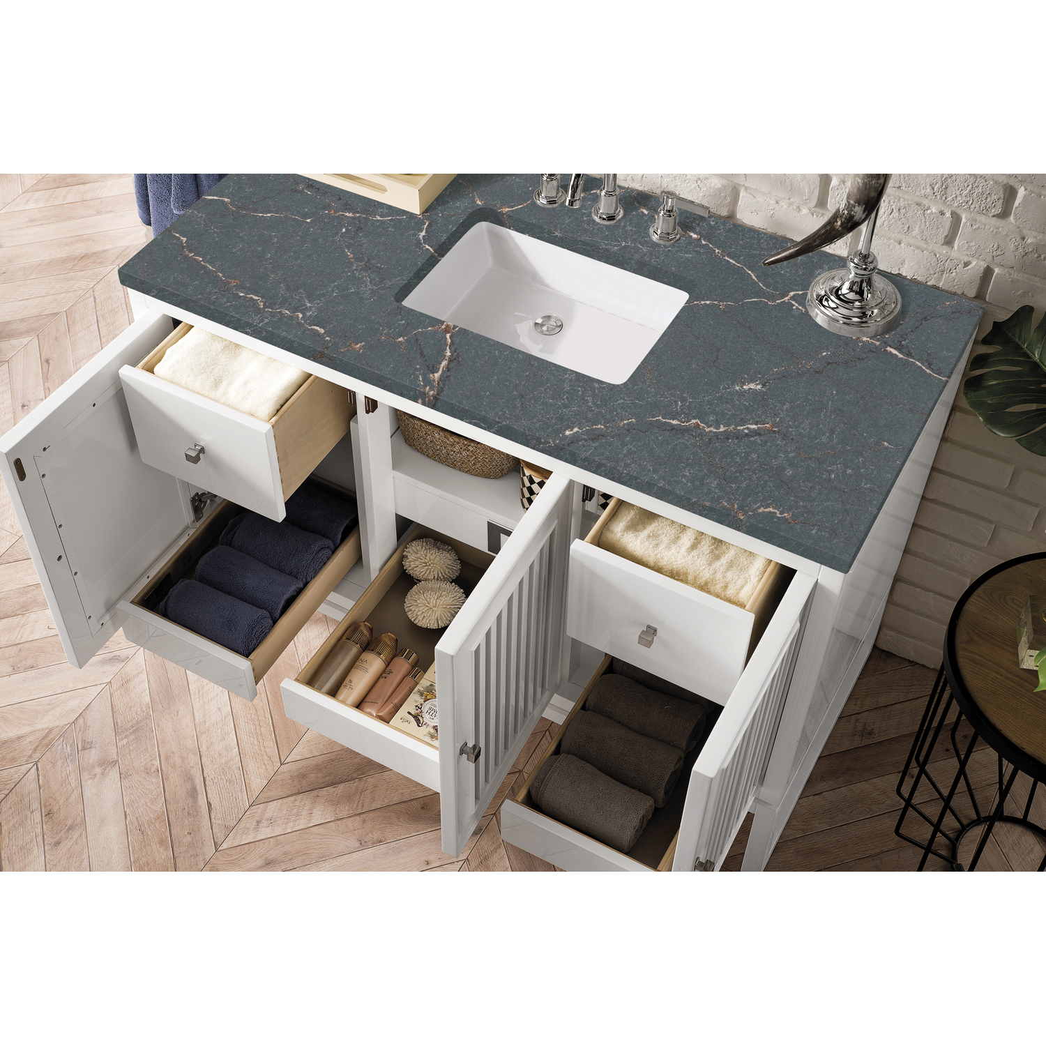 Customize your space with the Athens 48” Glossy White Single Vanity by James Martin Vanities. Part of the larger Athens modular collection, this incredible Vanity boasts an impressive amount of storage space and combines traditional charm with modern functionality. Premium standard features include soft-close undermount drawer glides and adjustable door hinges, brushed aluminum laminate drawer bottoms, and one bamboo drawer organizer. The Bright White finish is enhanced by the Parisien Bleu Silestone top, offering a deep bluish hue with broad and intricate neutral veins highlighted by fine coppery accents.Vanity set includes a 3cm eased edge Parisien Bleu Silestone top, which includes one white porcelain rectangular undermount sink that ships separately, as well as mounting brackets for easy installation. The top is pre-drilled for an 8" widespread faucet.Three door Glossy White single vanity with five interior drawers and shelf spaceCrafted from Poplar solids and plywood and is sealed inside and outside with our premium moisture and UV resistant coatingDrawer boxes are constructed using English Dovetail joinery, feature soft-close undermount glides and a Brushed Aluminum laminate drawer bottom.Polished Chrome hardwareIncludes one removable Bamboo drawer organizer trayThis cabinet may be installed with the wood base as a free standing vanity or mounted to the wall as a floating vanity. All mounting hardware is included.Includes a 120 UL-rated electrical component with dual power outlets and USB (Type A) portsFaucet sold separatelyCountertop is pre-drilled for one 3-hole 8" spreadMake an elegant focal point in your bathroom with the Athens Collection by James Martin Vanities. This durably crafted solid wood collection features tons of roomy storage options behind its sleek modern design. Constructed by expert craftsmen, this collection incorporates a wide variety of different pieces to address your every need. Its beautiful raised panel doors come with vertical grooved opening that allows you to either have it’s normal elegant acacia paneling showing through or if you want reverse it and show off the unique cork look in between those grooves giving you a more transitional look. This unique modular vanity collection is comprised of several different size vanities, mirrors, drawer units, tables and cabinets constructed from solid poplar hardwood and completed in either a mid-century acacia or glossy white finish. These pieces can be topped by any one of our eight custom tops giving that perfect look you been looking for. Soft closing doors and drawers provide smooth and quiet operations, while burnished bronzed finished metal hardware provides the perfect finishing touch. Other fine details include white Ceramic sinks with overflow, dovetail joint drawer construction, predrilled holes to accommodate 8 in. widespread faucets, and multi-layer finish on the cabinets provide beauty and durability for years to come.1 year warranty against manufacturer's defects. We will repair or replace any defective product, if the product is defective in material or workmanship at our discretion. No warranty is expressed or implied regarding damages resulting from consumer misuse.