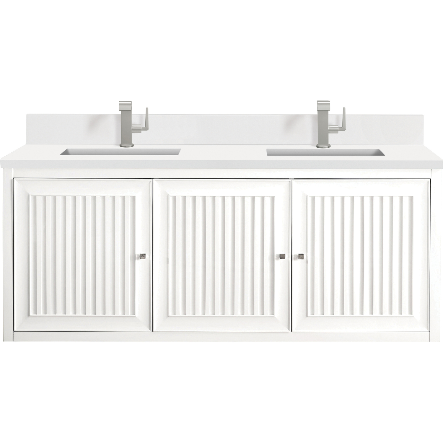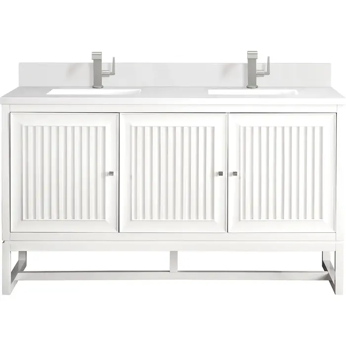 Customize your space with the Athens 60” Glossy White Double Vanity by James Martin Vanities. Part of the larger Athens modular collection, this incredible Vanity boasts an impressive amount of storage space and combines traditional charm with modern functionality. Premium standard features include soft-close undermount drawer glides and adjustable door hinges, brushed aluminum laminate drawer bottoms, and one bamboo drawer organizer. The timeless, White Zeus Silestone top and backsplash provides a contemporary touch.Vanity set includes a 3cm eased edge White Zeus Silestone top with matching backsplash, two white porcelain rectangular sinks and mounting brackets for easy installation. Top is pre-drilled for two single hole faucets. Faucets not included.Three door Glossy White double vanity with three interior drawers and shelf spaceCrafted from Poplar solids and plywood and is sealed inside and outside with our premium moisture and UV resistant coatingDrawer boxes are constructed using English Dovetail joinery, feature soft-close undermount glides and a Brushed Aluminum laminate drawer bottom.Polished Chrome hardwareIncludes one removable Bamboo drawer organizer trayThis cabinet may be installed with the wood base as a free standing vanity or mounted to the wall as a floating vanity. All mounting hardware is included.Includes a 120 UL-rated electrical component with dual power outlets and USB (Type A) portsMatching White Zeus 3cm Silestone backsplash included.Faucets sold separatelyMake an elegant focal point in your bathroom with the Athens Collection by James Martin Vanities. This durably crafted solid wood collection features tons of roomy storage options behind its sleek modern design. Constructed by expert craftsmen, this collection incorporates a wide variety of different pieces to address your every need. Its beautiful raised panel doors come with vertical grooved opening that allows you to either have it’s normal elegant acacia paneling showing through or if you want reverse it and show off the unique cork look in between those grooves giving you a more transitional look. This unique modular vanity collection is comprised of several different size vanities, mirrors, drawer units, tables and cabinets constructed from solid poplar hardwood and completed in either a mid-century acacia or glossy white finish. These pieces can be topped by any one of our eight custom tops giving that perfect look you been looking for. Soft closing doors and drawers provide smooth and quiet operations, while burnished bronzed finished metal hardware provides the perfect finishing touch. Other fine details include white Ceramic sinks with overflow, dovetail joint drawer construction, predrilled holes to accommodate 8 in. widespread faucets, and multi-layer finish on the cabinets provide beauty and durability for years to come.1 year warranty against manufacturer's defects. We will repair or replace any defective product, if the product is defective in material or workmanship at our discretion. No warranty is expressed or implied regarding damages resulting from consumer misuse.