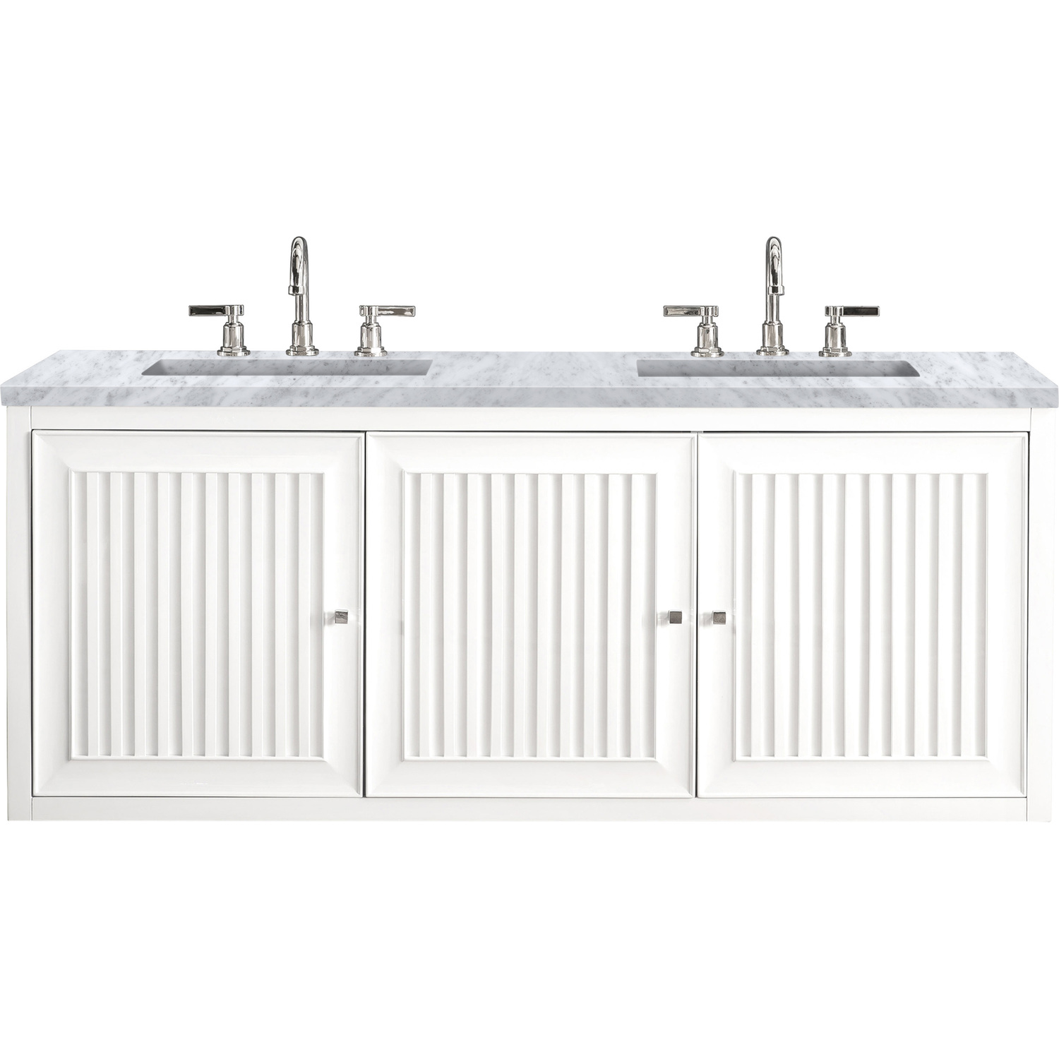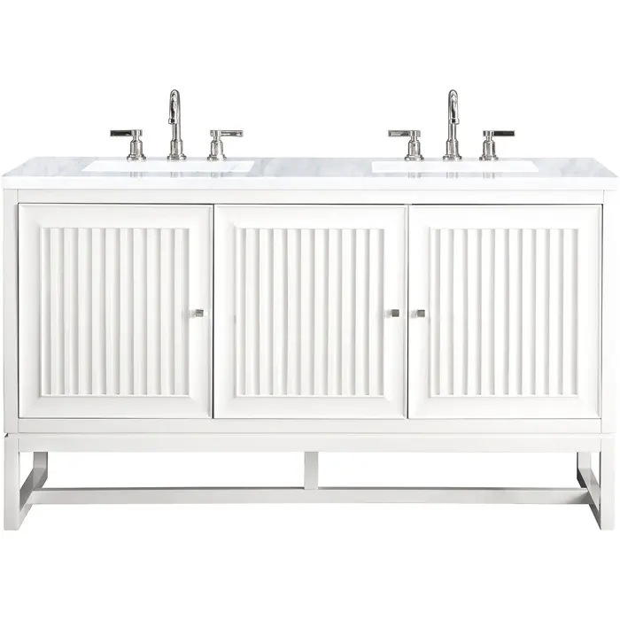 Bring a bit of the Greek Island home with the Athens 60” Glossy White Double Vanity by James Martin Vanities. Part of the larger Athens modular collection, this incredible Vanity boasts an impressive amount of storage space and combines traditional charm with modern functionality. Premium standard features include soft-close undermount drawer glides and adjustable door hinges, brushed aluminium laminate drawer bottoms, and one bamboo drawer organizer. The look is completed with a 3 CM eased edge Carrara Marble top and two white ceramic rectangular sinks.Three door Glossy White double vanity with three interior drawers and shelf spaceHardware Finish: Polished ChromeSolid kiln-dried Grade A hardwoodCabinet is finished inside and out with a premium undercoat finish for superior moisture and UV resistanceSoft-close undermount drawer glides and soft-close door hingesDrawer bottoms are lined with our signature brushed aluminum laminateOne 120 Volt UL rated electrical component with two electrical and two USB (2.0) outlets3 CM eased edge Carrara Marble top and two white porcelain rectangular sinksCountertop is pre-drilled for two 3-hole 8" spreadsThis cabinet can be wall-hung, legs are removable; mounting hardware includedFaucets sold separatelyMake an elegant focal point in your bathroom with the Athens Collection by James Martin Vanities. This durably crafted solid wood collection features tons of roomy storage options behind its sleek modern design. Constructed by expert craftsmen, this collection incorporates a wide variety of different pieces to address your every need. Its beautiful raised panel doors come with vertical grooved opening that allows you to either have it’s normal elegant acacia paneling showing through or if you want reverse it and show off the unique cork look in between those grooves giving you a more transitional look. This unique modular vanity collection is comprised of several different size vanities, mirrors, drawer units, tables and cabinets constructed from solid poplar hardwood and completed in either a mid-century acacia or glossy white finish. These pieces can be topped by any one of our eight custom tops giving that perfect look you been looking for. Soft closing doors and drawers provide smooth and quiet operations, while burnished bronzed finished metal hardware provides the perfect finishing touch. Other fine details include white Ceramic sinks with overflow, dovetail joint drawer construction, predrilled holes to accommodate 8 in. widespread faucets, and multi-layer finish on the cabinets provide beauty and durability for years to come.1 year warranty against manufacturer's defects. We will repair or replace any defective product, if the product is defective in material or workmanship at our discretion. No warranty is expressed or implied regarding damages resulting from consumer misuse.