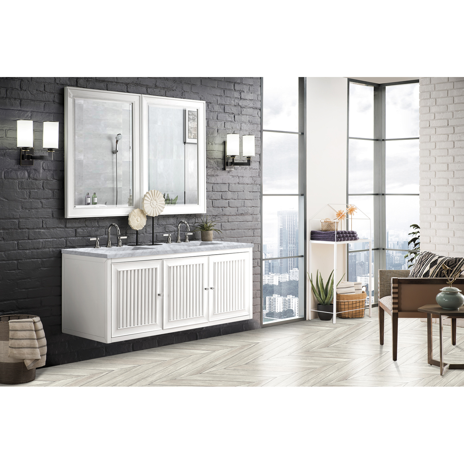- Make an elegant focal point in your bathroom with the Athens Collection by James Martin Vanities. This durably crafted solid wood collection features tons of roomy storage options behind its sleek modern design. Constructed by expert craftsmen, this collection incorporates a wide variety of different pieces to address your every need. Its beautiful raised panel doors come with vertical grooved opening that allows you to either have it’s normal elegant acacia paneling showing through or if you want reverse it and show off the unique cork look in between those grooves giving you a more transitional look. This unique modular vanity collection is comprised of several different size vanities, mirrors, drawer units, tables and cabinets constructed from solid poplar hardwood and completed in either a mid-century acacia or glossy white finish. These pieces can be topped by any one of our eight custom tops giving that perfect look you been looking for. Soft closing doors and drawers provide smooth and quiet operations, while burnished bronzed finished metal hardware provides the perfect finishing touch. Other fine details include white Ceramic sinks with overflow, dovetail joint drawer construction, predrilled holes to accommodate 8 in. widespread faucets, and multi-layer finish on the cabinets provide beauty and durability for years to come.