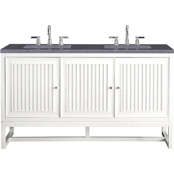 Bring a bit of the Greek Island home with the Athens 60” Glossy White Double Vanity by James Martin Vanities. Part of the larger Athens modular collection, this incredible Vanity boasts an impressive amount of storage space and combines traditional charm with modern functionality. Premium standard features include soft-close undermount drawer glides and adjustable door hinges, brushed aluminium laminate drawer bottoms, and one bamboo drawer organizer. The look is completed with a 3 CM eased edge Charcoal Soapstone Silestone top and two white ceramic rectangular sinks.Three door Glossy White double vanity with three interior drawers and shelf spaceHardware Finish: Polished ChromeSolid kiln-dried Grade A hardwoodCabinet is finished inside and out with a premium undercoat finish for superior moisture and UV resistanceSoft-close undermount drawer glides and soft-close door hingesDrawer bottoms are lined with our signature brushed aluminum laminateOne 120 Volt UL rated electrical component with two electrical and two USB (2.0) outlets3 CM eased edge Charcoal Soapstone Silestone top and two white porcelain rectangular sinksCountertop is pre-drilled for two 3-hole 8" spreadsThis cabinet can be wall-hung, legs are removable; mounting hardware includedFaucets sold separatelyMake an elegant focal point in your bathroom with the Athens Collection by James Martin Vanities. This durably crafted solid wood collection features tons of roomy storage options behind its sleek modern design. Constructed by expert craftsmen, this collection incorporates a wide variety of different pieces to address your every need. Its beautiful raised panel doors come with vertical grooved opening that allows you to either have it’s normal elegant acacia paneling showing through or if you want reverse it and show off the unique cork look in between those grooves giving you a more transitional look. This unique modular vanity collection is comprised of several different size vanities, mirrors, drawer units, tables and cabinets constructed from solid poplar hardwood and completed in either a mid-century acacia or glossy white finish. These pieces can be topped by any one of our eight custom tops giving that perfect look you been looking for. Soft closing doors and drawers provide smooth and quiet operations, while burnished bronzed finished metal hardware provides the perfect finishing touch. Other fine details include white Ceramic sinks with overflow, dovetail joint drawer construction, predrilled holes to accommodate 8 in. widespread faucets, and multi-layer finish on the cabinets provide beauty and durability for years to come.1 year warranty against manufacturer's defects. We will repair or replace any defective product, if the product is defective in material or workmanship at our discretion. No warranty is expressed or implied regarding damages resulting from consumer misuse.