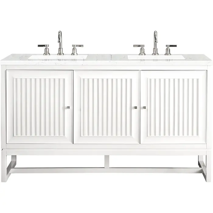 Bring a bit of the Greek Island home with the Athens 60” Glossy White Double Vanity by James Martin Vanities. Part of the larger Athens modular collection, this incredible Vanity boasts an impressive amount of storage space and combines traditional charm with modern functionality. Premium standard features include soft-close undermount drawer glides and adjustable door hinges, brushed aluminium laminate drawer bottoms, and one bamboo drawer organizer. The look is completed with a 3 CM eased edge Eternal Marfil Silestone top and two white ceramic rectangular sinks.Three door Glossy White double vanity with three interior drawers and shelf spaceHardware Finish: Polished ChromeSolid kiln-dried Grade A hardwoodCabinet is finished inside and out with a premium undercoat finish for superior moisture and UV resistanceSoft-close undermount drawer glides and soft-close door hingesDrawer bottoms are lined with our signature brushed aluminum laminateOne 120 Volt UL rated electrical component with two electrical and two USB (2.0) outlets3 CM eased edge Eternal Jasmine Pearl Silestone top and two white porcelain rectangular sinksCountertop is pre-drilled for two 3-hole 8" spreadsThis cabinet can be wall-hung, legs are removable; mounting hardware includedFaucets sold separatelyMake an elegant focal point in your bathroom with the Athens Collection by James Martin Vanities. This durably crafted solid wood collection features tons of roomy storage options behind its sleek modern design. Constructed by expert craftsmen, this collection incorporates a wide variety of different pieces to address your every need. Its beautiful raised panel doors come with vertical grooved opening that allows you to either have it’s normal elegant acacia paneling showing through or if you want reverse it and show off the unique cork look in between those grooves giving you a more transitional look. This unique modular vanity collection is comprised of several different size vanities, mirrors, drawer units, tables and cabinets constructed from solid poplar hardwood and completed in either a mid-century acacia or glossy white finish. These pieces can be topped by any one of our eight custom tops giving that perfect look you been looking for. Soft closing doors and drawers provide smooth and quiet operations, while burnished bronzed finished metal hardware provides the perfect finishing touch. Other fine details include white Ceramic sinks with overflow, dovetail joint drawer construction, predrilled holes to accommodate 8 in. widespread faucets, and multi-layer finish on the cabinets provide beauty and durability for years to come.1 year warranty against manufacturer's defects. We will repair or replace any defective product, if the product is defective in material or workmanship at our discretion. No warranty is expressed or implied regarding damages resulting from consumer misuse.