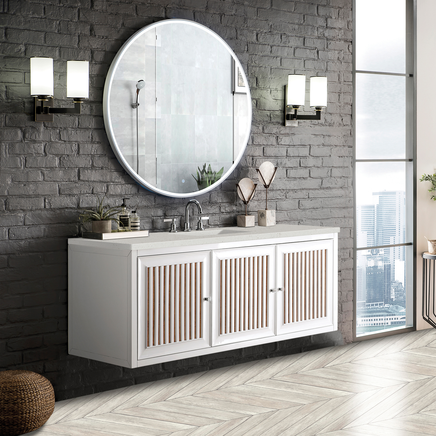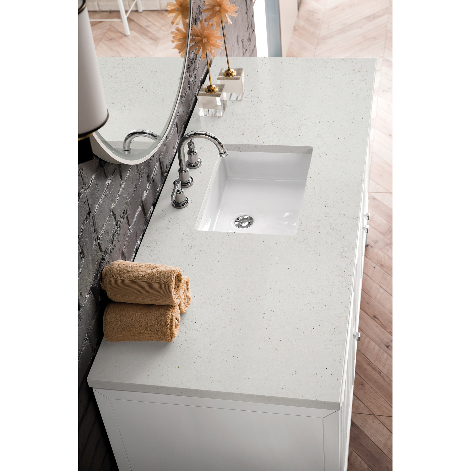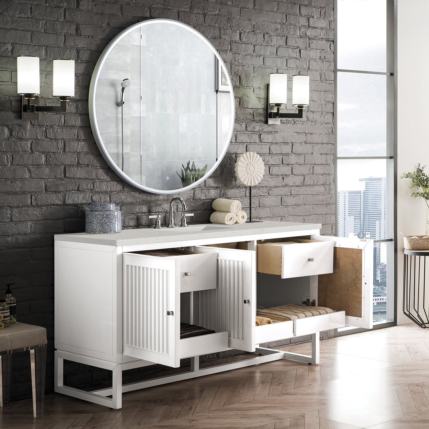 Customize your space with the Athens 60” Glossy White Single Vanity by James Martin Vanities. Part of the larger Athens modular collection, this incredible Vanity boasts an impressive amount of storage space and combines traditional charm with modern functionality. Premium standard features include soft-close undermount drawer glides and adjustable door hinges, brushed aluminum laminate drawer bottoms, and one bamboo drawer organizer. . The Lime Delight Silestone top lends warm, textured beige tones to perfectly complement the wood finish on the vanity.Vanity set includes a 3cm eased edge Limestone Delight Silestone top. Includes a white porcelain rectangular undermount sink that ships separately and mounting brackets for easy installation. Top is pre-drilled for 8" widespread faucet. Faucet not includeThree door Glossy White single vanity with five interior drawers and shelf spaceCrafted from Poplar solids and plywood and is sealed inside and outside with our premium moisture and UV resistant coatingDrawer boxes are constructed using English Dovetail joinery, feature soft-close undermount glides and a Brushed Aluminum laminate drawer bottom.Polished Chrome hardwareIncludes one removable Bamboo drawer organizer trayThis cabinet may be installed with the wood base as a free standing vanity or mounted to the wall as a floating vanity. All mounting hardware is included.Includes a 120 UL-rated electrical component with dual power outlets and USB (Type A) portsFaucet sold separatelyCountertop is pre-drilled for one 3-hole 8" spreadMake an elegant focal point in your bathroom with the Athens Collection by James Martin Vanities. This durably crafted solid wood collection features tons of roomy storage options behind its sleek modern design. Constructed by expert craftsmen, this collection incorporates a wide variety of different pieces to address your every need. Its beautiful raised panel doors come with vertical grooved opening that allows you to either have it’s normal elegant acacia paneling showing through or if you want reverse it and show off the unique cork look in between those grooves giving you a more transitional look. This unique modular vanity collection is comprised of several different size vanities, mirrors, drawer units, tables and cabinets constructed from solid poplar hardwood and completed in either a mid-century acacia or glossy white finish. These pieces can be topped by any one of our eight custom tops giving that perfect look you been looking for. Soft closing doors and drawers provide smooth and quiet operations, while burnished bronzed finished metal hardware provides the perfect finishing touch. Other fine details include white Ceramic sinks with overflow, dovetail joint drawer construction, predrilled holes to accommodate 8 in. widespread faucets, and multi-layer finish on the cabinets provide beauty and durability for years to come.1 year warranty against manufacturer's defects. We will repair or replace any defective product, if the product is defective in material or workmanship at our discretion. No warranty is expressed or implied regarding damages resulting from consumer misuse.