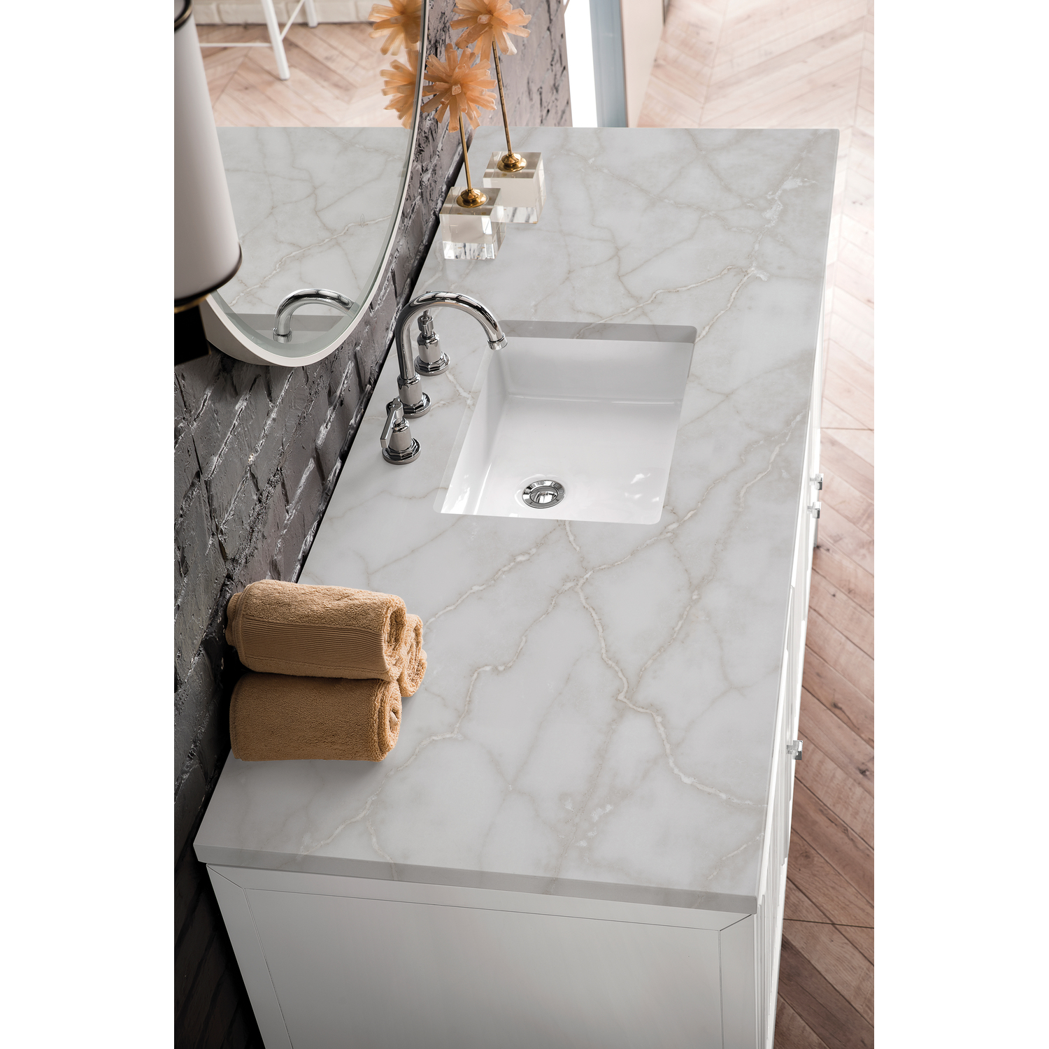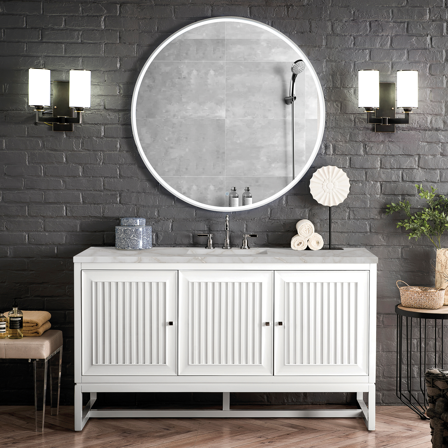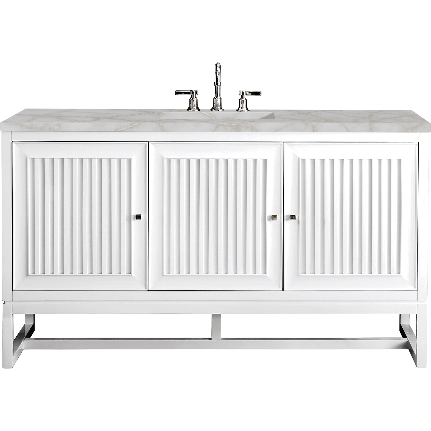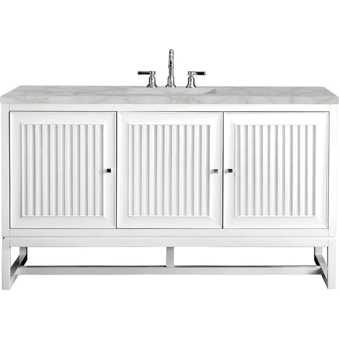 Customize your space with the Athens 60” Glossy White Single Vanity by James Martin Vanities. Part of the larger Athens modular collection, this incredible Vanity boasts an impressive amount of storage space and combines traditional charm with modern functionality. Premium standard features include soft-close undermount drawer glides and adjustable door hinges, brushed aluminum laminate drawer bottoms, and one bamboo drawer organizer. The Bright White finish is accented by the neutral background of the Victorian Silver Silestone top, boasting champagne metallic accents which seamlessly complement wood tones.Vanity set includes a 3cm eased edge Victorian Silver Silestone top, a white porcelain rectangular sink and mounting brackets for easy installation. Top is pre-drilled for an 8" widespread faucet. Faucet not included.Three door Glossy White single vanity with five interior drawers and shelf spaceCrafted from Poplar solids and plywood and is sealed inside and outside with our premium moisture and UV resistant coatingDrawer boxes are constructed using English Dovetail joinery, feature soft-close undermount glides and a Brushed Aluminum laminate drawer bottom.Polished Chrome hardwareIncludes one removable Bamboo drawer organizer trayThis cabinet may be installed with the wood base as a free standing vanity or mounted to the wall as a floating vanity. All mounting hardware is included.Includes a 120 UL-rated electrical component with dual power outlets and USB (Type A) portsFaucet sold separatelyCountertop is pre-drilled for one 3-hole 8" spreadMake an elegant focal point in your bathroom with the Athens Collection by James Martin Vanities. This durably crafted solid wood collection features tons of roomy storage options behind its sleek modern design. Constructed by expert craftsmen, this collection incorporates a wide variety of different pieces to address your every need. Its beautiful raised panel doors come with vertical grooved opening that allows you to either have it’s normal elegant acacia paneling showing through or if you want reverse it and show off the unique cork look in between those grooves giving you a more transitional look. This unique modular vanity collection is comprised of several different size vanities, mirrors, drawer units, tables and cabinets constructed from solid poplar hardwood and completed in either a mid-century acacia or glossy white finish. These pieces can be topped by any one of our eight custom tops giving that perfect look you been looking for. Soft closing doors and drawers provide smooth and quiet operations, while burnished bronzed finished metal hardware provides the perfect finishing touch. Other fine details include white Ceramic sinks with overflow, dovetail joint drawer construction, predrilled holes to accommodate 8 in. widespread faucets, and multi-layer finish on the cabinets provide beauty and durability for years to come.1 year warranty against manufacturer's defects. We will repair or replace any defective product, if the product is defective in material or workmanship at our discretion. No warranty is expressed or implied regarding damages resulting from consumer misuse.