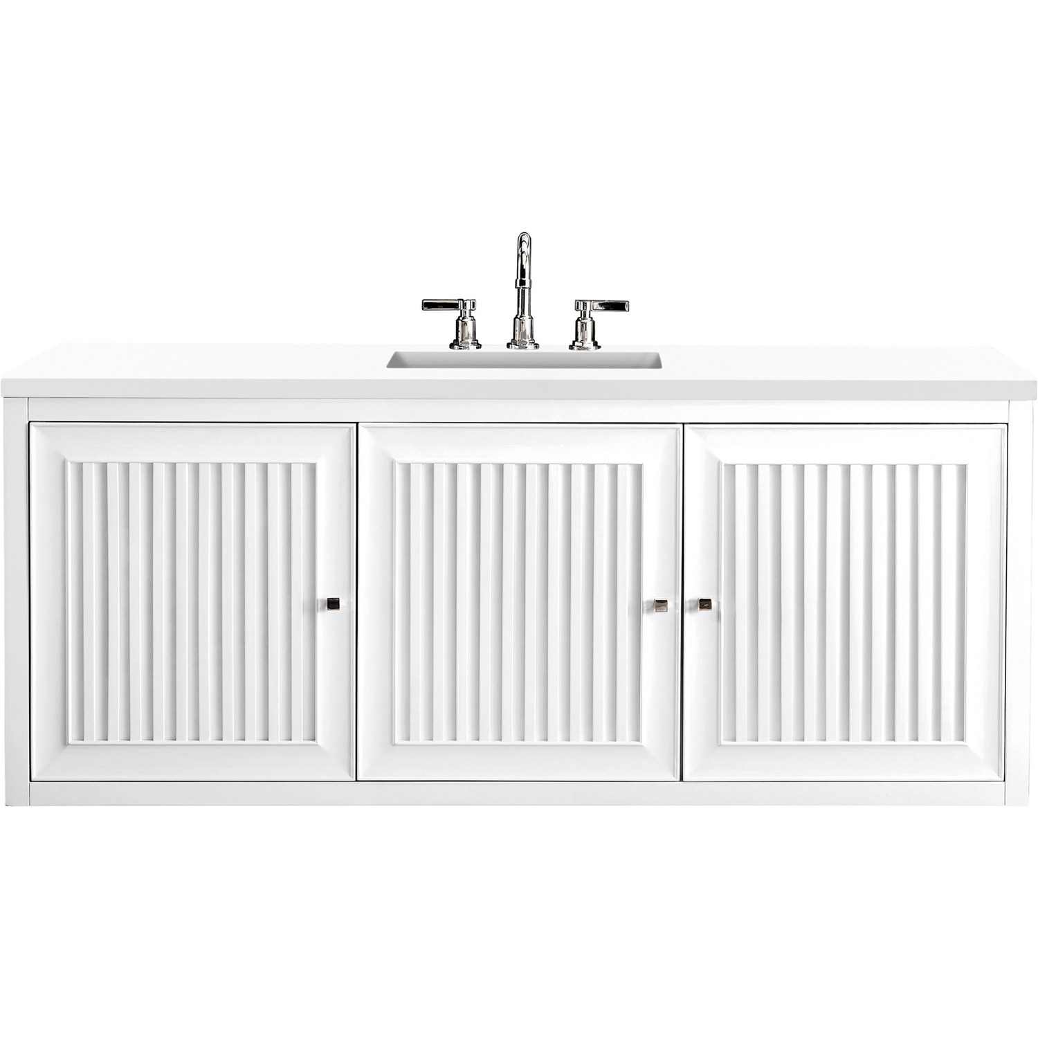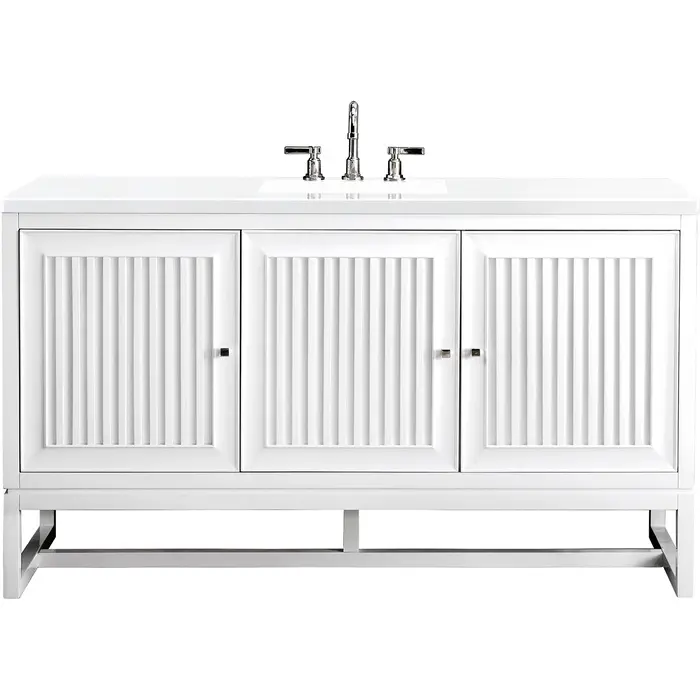 Bring a bit of the Greek Island home with the Athens 60” Glossy White Single Vanity by James Martin Vanities. Part of the larger Athens modular collection, this incredible Vanity boasts an impressive amount of storage space and combines traditional charm with modern functionality. Premium standard features include soft-close undermount drawer glides and adjustable door hinges, brushed aluminium laminate drawer bottoms, and one bamboo drawer organizer. The look is completed with a 3 CM eased edge White Zeus Silestone top and one white ceramic rectangular sink.Three door Glossy White single vanity with five interior drawers and shelf spaceHardware Finish: Polished ChromeSolid kiln-dried Grade A hardwoodCabinet is finished inside and out with a premium undercoat finish for superior moisture and UV resistanceSoft-close undermount drawer glides and soft-close door hingesDrawer bottoms are lined with our signature brushed aluminum laminateOne 120 Volt UL rated electrical component with two electrical and two USB (2.0) outlets3 CM eased edge White Zeus Silestone top and one white porcelain rectangular sinkCountertop is pre-drilled for one 3-hole 8" spreadThis cabinet can be wall-hung, legs are removable; mounting hardware includedFaucet sold separatelyMake an elegant focal point in your bathroom with the Athens Collection by James Martin Vanities. This durably crafted solid wood collection features tons of roomy storage options behind its sleek modern design. Constructed by expert craftsmen, this collection incorporates a wide variety of different pieces to address your every need. Its beautiful raised panel doors come with vertical grooved opening that allows you to either have it’s normal elegant acacia paneling showing through or if you want reverse it and show off the unique cork look in between those grooves giving you a more transitional look. This unique modular vanity collection is comprised of several different size vanities, mirrors, drawer units, tables and cabinets constructed from solid poplar hardwood and completed in either a mid-century acacia or glossy white finish. These pieces can be topped by any one of our eight custom tops giving that perfect look you been looking for. Soft closing doors and drawers provide smooth and quiet operations, while burnished bronzed finished metal hardware provides the perfect finishing touch. Other fine details include white Ceramic sinks with overflow, dovetail joint drawer construction, predrilled holes to accommodate 8 in. widespread faucets, and multi-layer finish on the cabinets provide beauty and durability for years to come.1 year warranty against manufacturer's defects. We will repair or replace any defective product, if the product is defective in material or workmanship at our discretion. No warranty is expressed or implied regarding damages resulting from consumer misuse.
