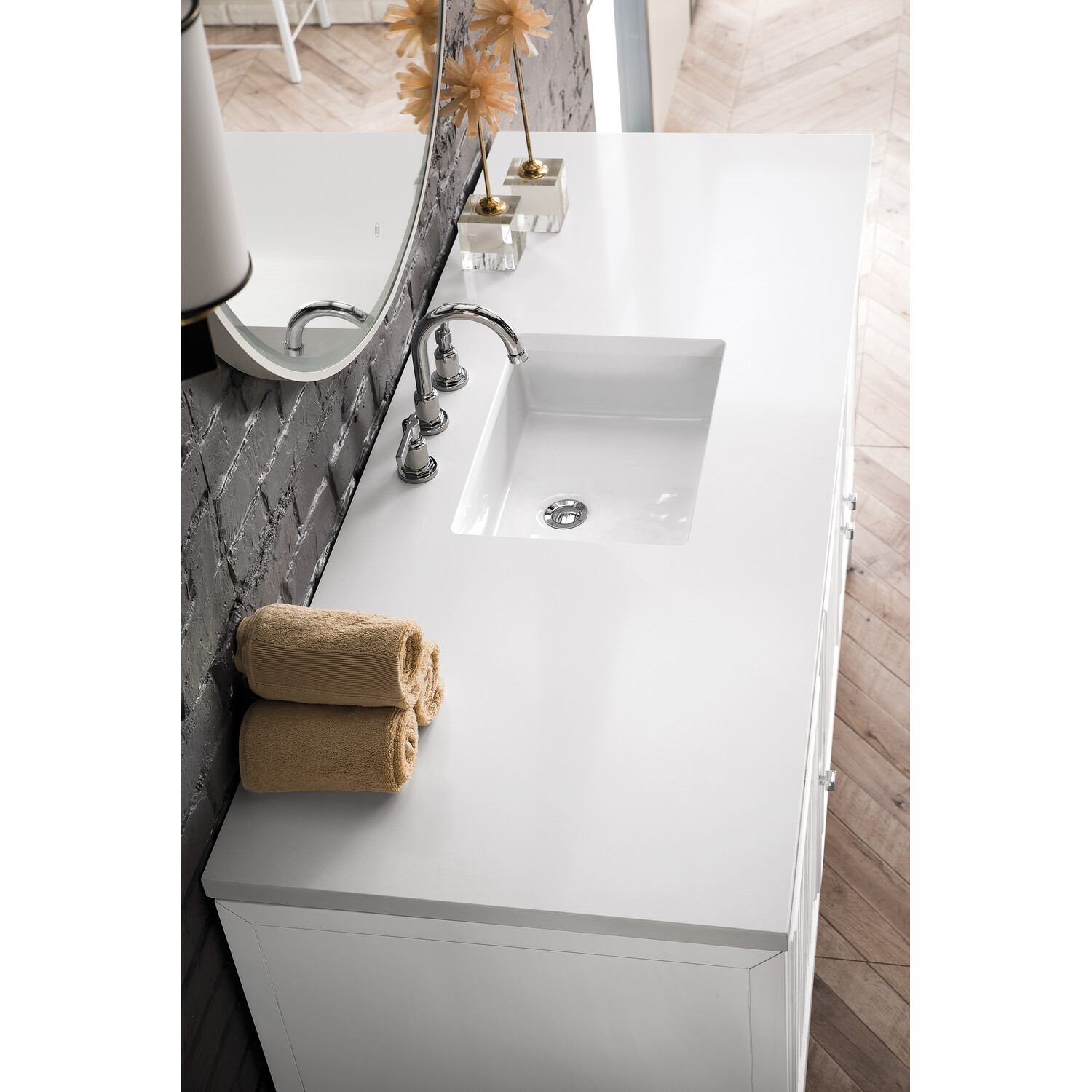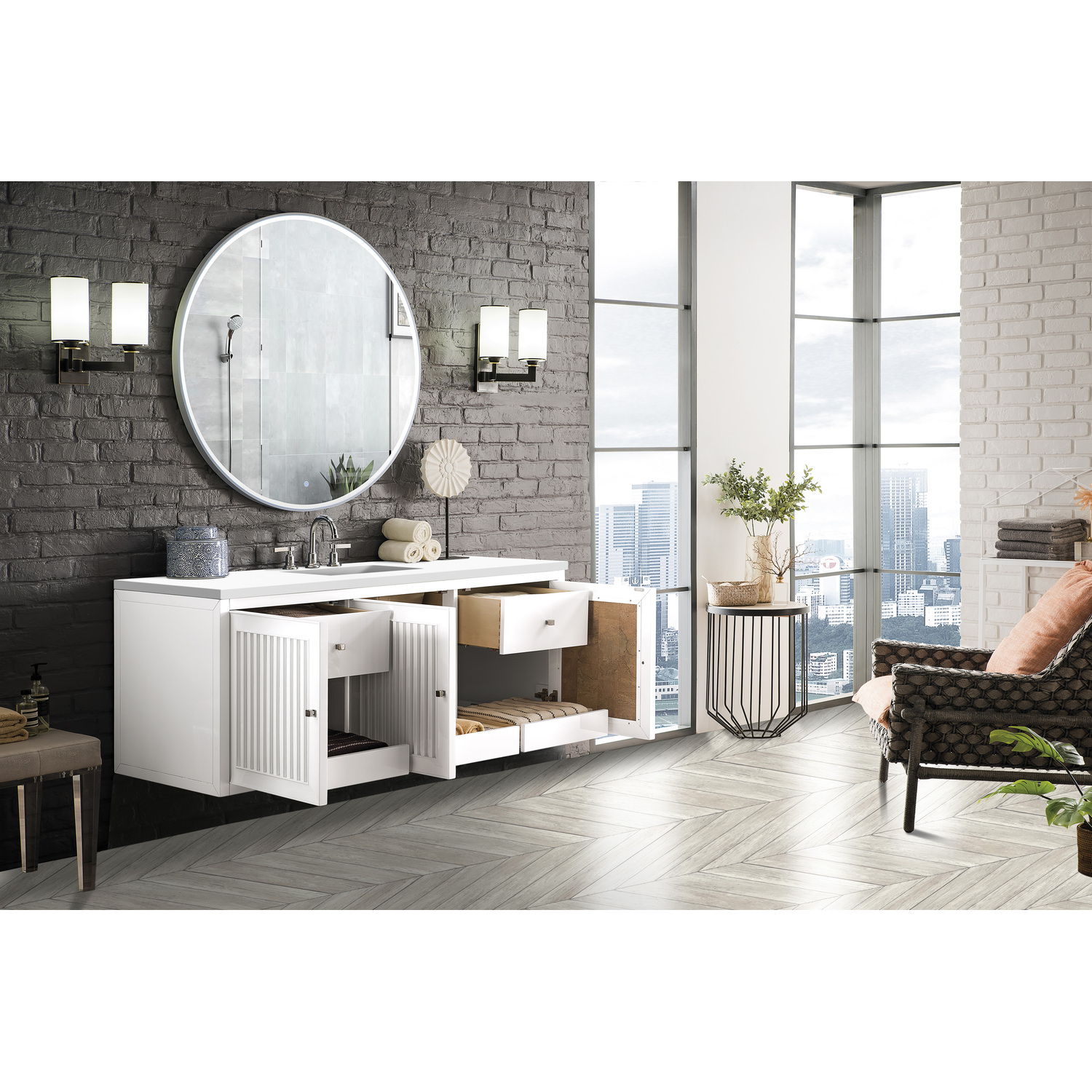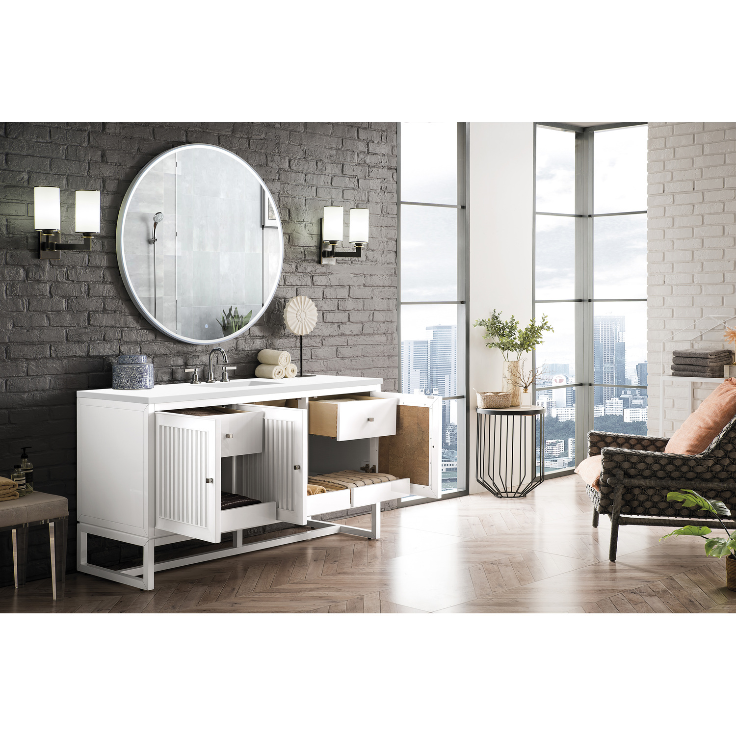 - Make an elegant focal point in your bathroom with the Athens Collection by James Martin Vanities. This durably crafted solid wood collection features tons of roomy storage options behind its sleek modern design. Constructed by expert craftsmen, this collection incorporates a wide variety of different pieces to address your every need. Its beautiful raised panel doors come with vertical grooved opening that allows you to either have it’s normal elegant acacia paneling showing through or if you want reverse it and show off the unique cork look in between those grooves giving you a more transitional look. This unique modular vanity collection is comprised of several different size vanities, mirrors, drawer units, tables and cabinets constructed from solid poplar hardwood and completed in either a mid-century acacia or glossy white finish. These pieces can be topped by any one of our eight custom tops giving that perfect look you been looking for. Soft closing doors and drawers provide smooth and quiet operations, while burnished bronzed finished metal hardware provides the perfect finishing touch. Other fine details include white Ceramic sinks with overflow, dovetail joint drawer construction, predrilled holes to accommodate 8 in. widespread faucets, and multi-layer finish on the cabinets provide beauty and durability for years to come.