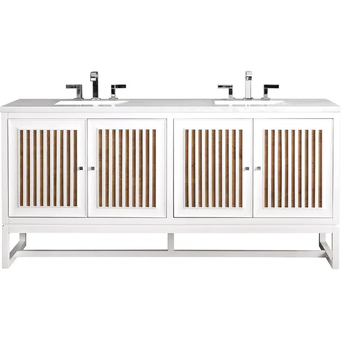 Bring a bit of the Greek Island home with the Athens 72” Glossy White Double Vanity by James Martin Vanities. Part of the larger Athens modular collection, this incredible Vanity boasts an impressive amount of storage space and combines traditional charm with modern functionality. Premium standard features include soft-close undermount drawer glides and adjustable door hinges, brushed aluminium laminate drawer bottoms, and one bamboo drawer organizer. The look is completed with a 3 CM eased edge Arctic Fall Solid Surface top and two white ceramic rectangular sinks.Four door Glossy White double vanity with three interior drawers and shelf spaceHardware Finish: Polished ChromeSolid kiln-dried Grade A hardwoodCabinet is finished inside and out with a premium undercoat finish for superior moisture and UV resistanceSoft-close undermount drawer glides and soft-close door hingesDrawer bottoms are lined with our signature brushed aluminum laminateOne 120 Volt UL rated electrical component with two electrical and two USB (2.0) outlets3 CM eased edge Arctic Fall Solid Surface top and two white porcelain rectangular sinksCountertop is pre-drilled for two 3-hole 8" spreadsThis cabinet can be wall-hung, legs are removable; mounting hardware includedFaucets sold separatelyMake an elegant focal point in your bathroom with the Athens Collection by James Martin Vanities. This durably crafted solid wood collection features tons of roomy storage options behind its sleek modern design. Constructed by expert craftsmen, this collection incorporates a wide variety of different pieces to address your every need. Its beautiful raised panel doors come with vertical grooved opening that allows you to either have it’s normal elegant acacia paneling showing through or if you want reverse it and show off the unique cork look in between those grooves giving you a more transitional look. This unique modular vanity collection is comprised of several different size vanities, mirrors, drawer units, tables and cabinets constructed from solid poplar hardwood and completed in either a mid-century acacia or glossy white finish. These pieces can be topped by any one of our eight custom tops giving that perfect look you been looking for. Soft closing doors and drawers provide smooth and quiet operations, while burnished bronzed finished metal hardware provides the perfect finishing touch. Other fine details include white Ceramic sinks with overflow, dovetail joint drawer construction, predrilled holes to accommodate 8 in. widespread faucets, and multi-layer finish on the cabinets provide beauty and durability for years to come.1 year warranty against manufacturer's defects. We will repair or replace any defective product, if the product is defective in material or workmanship at our discretion. No warranty is expressed or implied regarding damages resulting from consumer misuse.