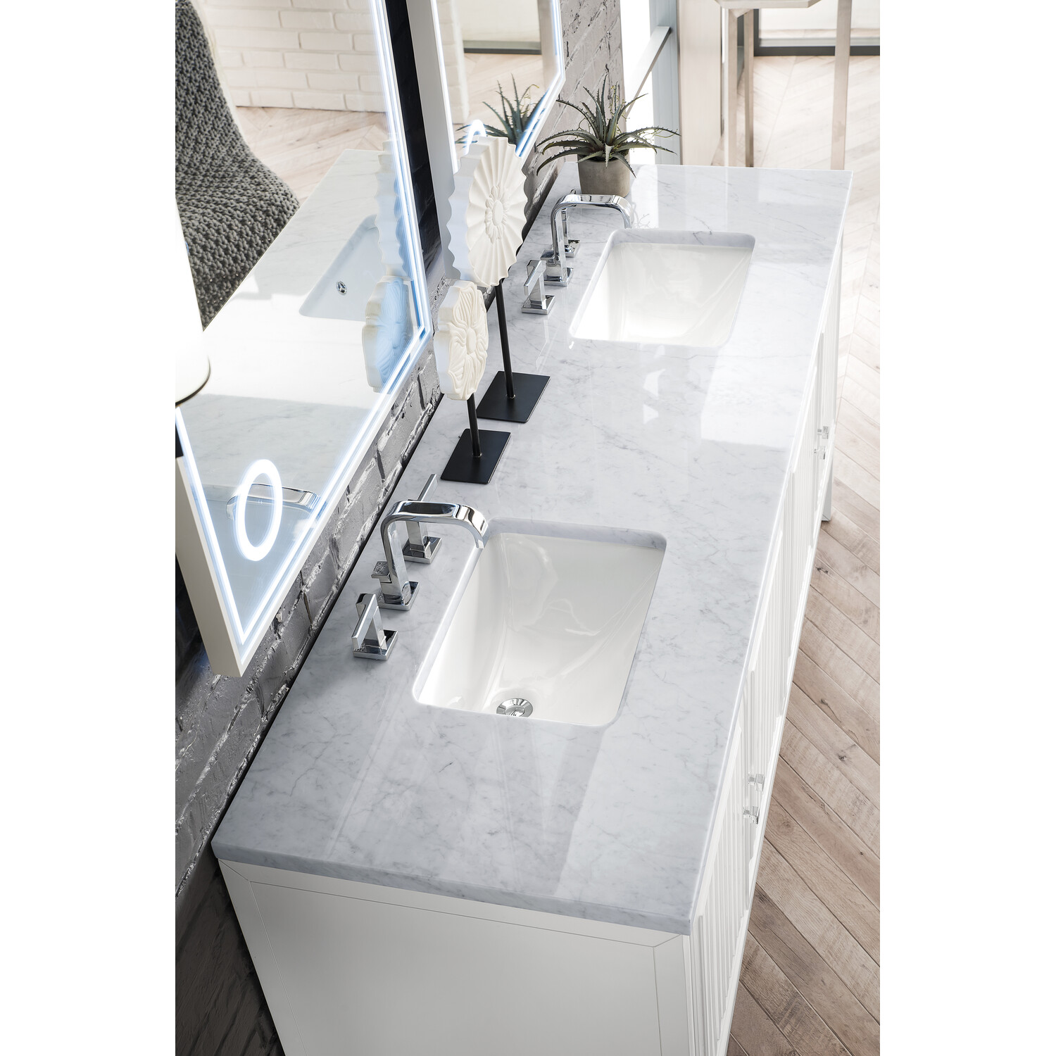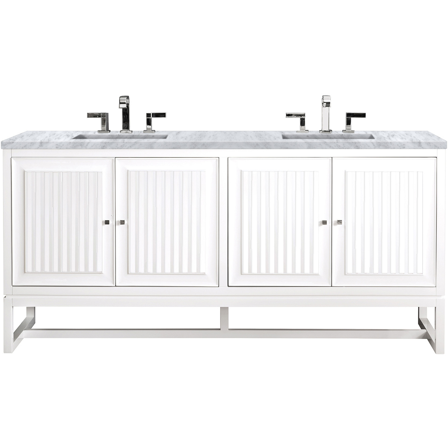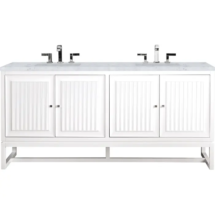 Bring a bit of the Greek Island home with the Athens 72” Glossy White Double Vanity by James Martin Vanities. Part of the larger Athens modular collection, this incredible Vanity boasts an impressive amount of storage space and combines traditional charm with modern functionality. Premium standard features include soft-close undermount drawer glides and adjustable door hinges, brushed aluminium laminate drawer bottoms, and one bamboo drawer organizer. The look is completed with a 3 CM eased edge Carrara Marble top and two white ceramic rectangular sinks.Four door Glossy White double vanity with three interior drawers and shelf spaceHardware Finish: Polished ChromeSolid kiln-dried Grade A hardwoodCabinet is finished inside and out with a premium undercoat finish for superior moisture and UV resistanceSoft-close undermount drawer glides and soft-close door hingesDrawer bottoms are lined with our signature brushed aluminum laminateOne 120 Volt UL rated electrical component with two electrical and two USB (2.0) outlets3 CM eased edge Carrara Marble top and two white porcelain rectangular sinksCountertop is pre-drilled for two 3-hole 8" spreadsThis cabinet can be wall-hung, legs are removable; mounting hardware includedFaucets sold separatelyMake an elegant focal point in your bathroom with the Athens Collection by James Martin Vanities. This durably crafted solid wood collection features tons of roomy storage options behind its sleek modern design. Constructed by expert craftsmen, this collection incorporates a wide variety of different pieces to address your every need. Its beautiful raised panel doors come with vertical grooved opening that allows you to either have it’s normal elegant acacia paneling showing through or if you want reverse it and show off the unique cork look in between those grooves giving you a more transitional look. This unique modular vanity collection is comprised of several different size vanities, mirrors, drawer units, tables and cabinets constructed from solid poplar hardwood and completed in either a mid-century acacia or glossy white finish. These pieces can be topped by any one of our eight custom tops giving that perfect look you been looking for. Soft closing doors and drawers provide smooth and quiet operations, while burnished bronzed finished metal hardware provides the perfect finishing touch. Other fine details include white Ceramic sinks with overflow, dovetail joint drawer construction, predrilled holes to accommodate 8 in. widespread faucets, and multi-layer finish on the cabinets provide beauty and durability for years to come.1 year warranty against manufacturer's defects. We will repair or replace any defective product, if the product is defective in material or workmanship at our discretion. No warranty is expressed or implied regarding damages resulting from consumer misuse.