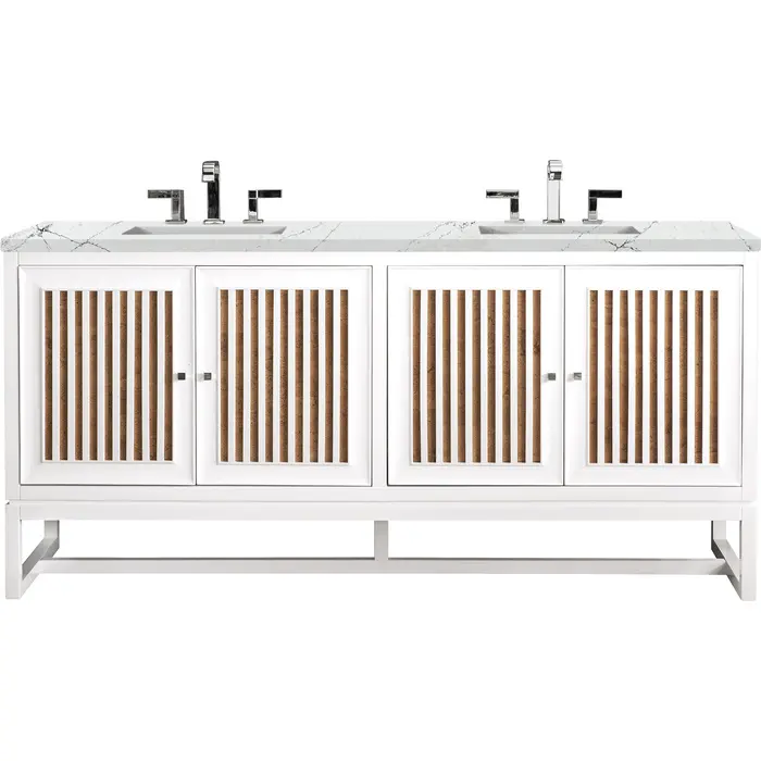 Bring a bit of the Greek Island home with the Athens 72” Glossy White Double Vanity by James Martin Vanities. Part of the larger Athens modular collection, this incredible Vanity boasts an impressive amount of storage space and combines traditional charm with modern functionality. Premium standard features include soft-close undermount drawer glides and adjustable door hinges, brushed aluminium laminate drawer bottoms, and one bamboo drawer organizer. The look is completed with a 3 CM eased edge Ethereal Noctis Silestone top and two white ceramic rectangular sinks.Four door Glossy White double vanity with three interior drawers and shelf spaceHardware Finish: Polished ChromeSolid kiln-dried Grade A hardwoodCabinet is finished inside and out with a premium undercoat finish for superior moisture and UV resistanceSoft-close undermount drawer glides and soft-close door hingesDrawer bottoms are lined with our signature brushed aluminum laminateOne 120 Volt UL rated electrical component with two electrical and two USB (2.0) outlets3 CM eased edge Ethereal Noctis Silestone top and two white porcelain rectangular sinksCountertop is pre-drilled for two 3-hole 8" spreadsThis cabinet can be wall-hung, legs are removable; mounting hardware includedFaucets sold separatelyMake an elegant focal point in your bathroom with the Athens Collection by James Martin Vanities. This durably crafted solid wood collection features tons of roomy storage options behind its sleek modern design. Constructed by expert craftsmen, this collection incorporates a wide variety of different pieces to address your every need. Its beautiful raised panel doors come with vertical grooved opening that allows you to either have it’s normal elegant acacia paneling showing through or if you want reverse it and show off the unique cork look in between those grooves giving you a more transitional look. This unique modular vanity collection is comprised of several different size vanities, mirrors, drawer units, tables and cabinets constructed from solid poplar hardwood and completed in either a mid-century acacia or glossy white finish. These pieces can be topped by any one of our eight custom tops giving that perfect look you been looking for. Soft closing doors and drawers provide smooth and quiet operations, while burnished bronzed finished metal hardware provides the perfect finishing touch. Other fine details include white Ceramic sinks with overflow, dovetail joint drawer construction, predrilled holes to accommodate 8 in. widespread faucets, and multi-layer finish on the cabinets provide beauty and durability for years to come.1 year warranty against manufacturer's defects. We will repair or replace any defective product, if the product is defective in material or workmanship at our discretion. No warranty is expressed or implied regarding damages resulting from consumer misuse.