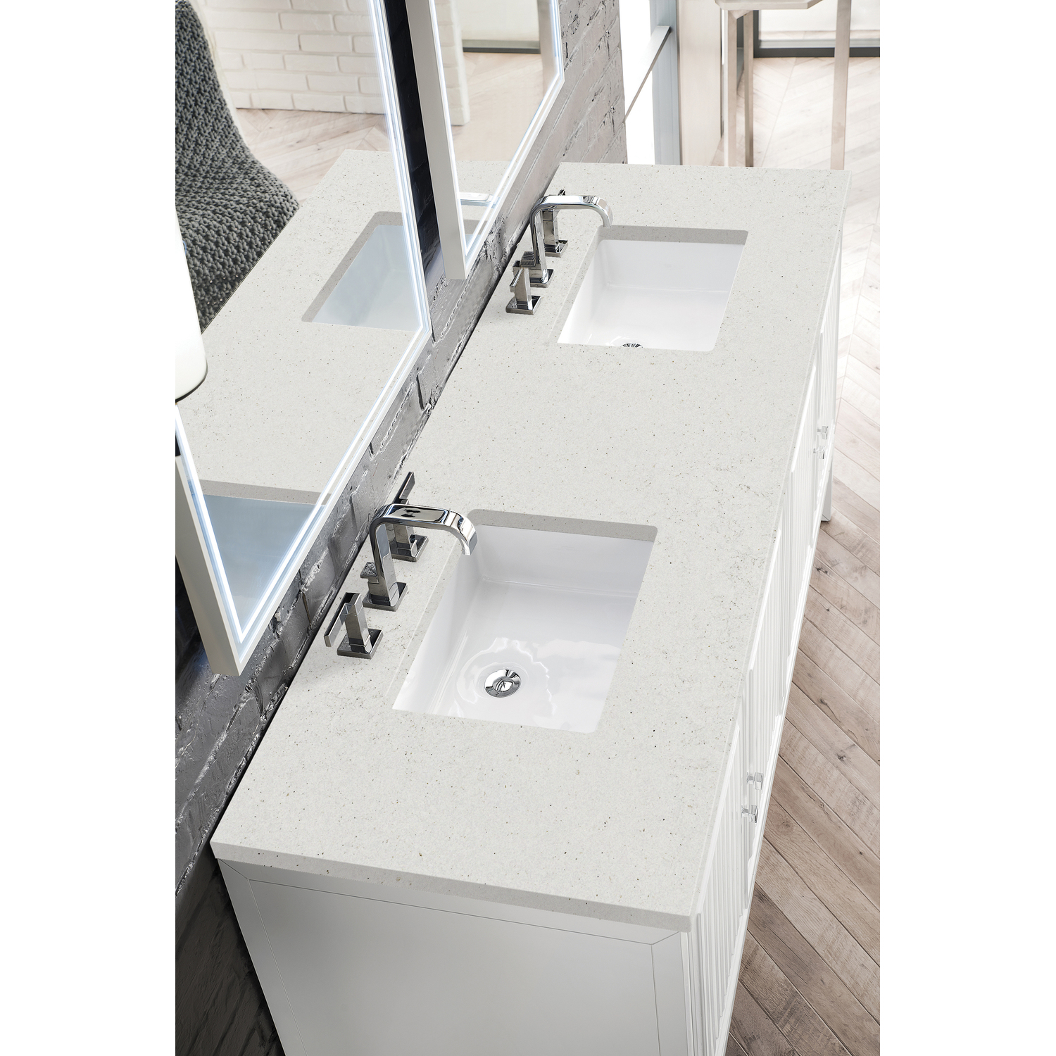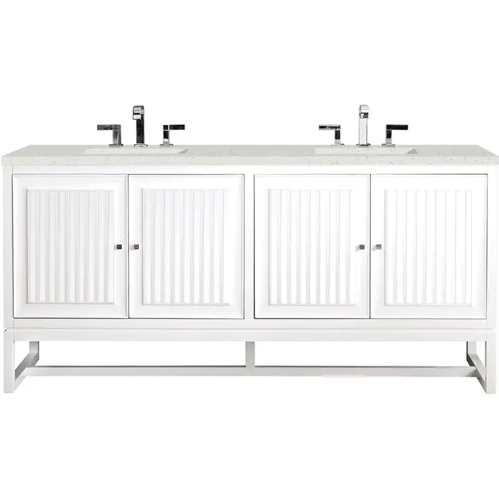 Customize your space with the Athens 72” Glossy White Double Vanity by James Martin Vanities. Part of the larger Athens modular collection, this incredible Vanity boasts an impressive amount of storage space and combines traditional charm with modern functionality. Premium standard features include soft-close undermount drawer glides and adjustable door hinges, brushed aluminum laminate drawer bottoms, and one bamboo drawer organizer. The Lime Delight Silestone top lends warm, textured beige tones to perfectly complement the wood finish on the vanity.Vanity set includes a 3cm eased edge Limestone Delight Silestone top. Includes two white porcelain rectangular undermount sinks that ship separately and mounting brackets for easy installation. Top is pre-drilled for two 8" widespread faucets. Faucets notFour door Glossy White double vanity with three interior drawers and shelf spaceCrafted from Poplar solids and plywood and is sealed inside and outside with our premium moisture and UV resistant coatingDrawer boxes are constructed using English Dovetail joinery, feature soft-close undermount glides and a Brushed Aluminum laminate drawer bottom.Polished Chrome hardwareIncludes one removable Bamboo drawer organizer trayThis cabinet may be installed with the wood base as a free standing vanity or mounted to the wall as a floating vanity. All mounting hardware is included.Includes a 120 UL-rated electrical component with dual power outlets and USB (Type A) portsFaucets sold separatelyCountertop is pre-drilled for two 3-hole 8" spreadsMake an elegant focal point in your bathroom with the Athens Collection by James Martin Vanities. This durably crafted solid wood collection features tons of roomy storage options behind its sleek modern design. Constructed by expert craftsmen, this collection incorporates a wide variety of different pieces to address your every need. Its beautiful raised panel doors come with vertical grooved opening that allows you to either have it’s normal elegant acacia paneling showing through or if you want reverse it and show off the unique cork look in between those grooves giving you a more transitional look. This unique modular vanity collection is comprised of several different size vanities, mirrors, drawer units, tables and cabinets constructed from solid poplar hardwood and completed in either a mid-century acacia or glossy white finish. These pieces can be topped by any one of our eight custom tops giving that perfect look you been looking for. Soft closing doors and drawers provide smooth and quiet operations, while burnished bronzed finished metal hardware provides the perfect finishing touch. Other fine details include white Ceramic sinks with overflow, dovetail joint drawer construction, predrilled holes to accommodate 8 in. widespread faucets, and multi-layer finish on the cabinets provide beauty and durability for years to come.1 year warranty against manufacturer's defects. We will repair or replace any defective product, if the product is defective in material or workmanship at our discretion. No warranty is expressed or implied regarding damages resulting from consumer misuse.
