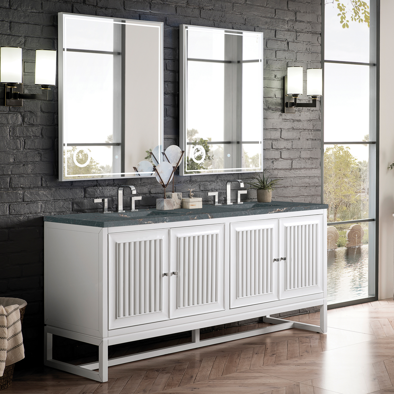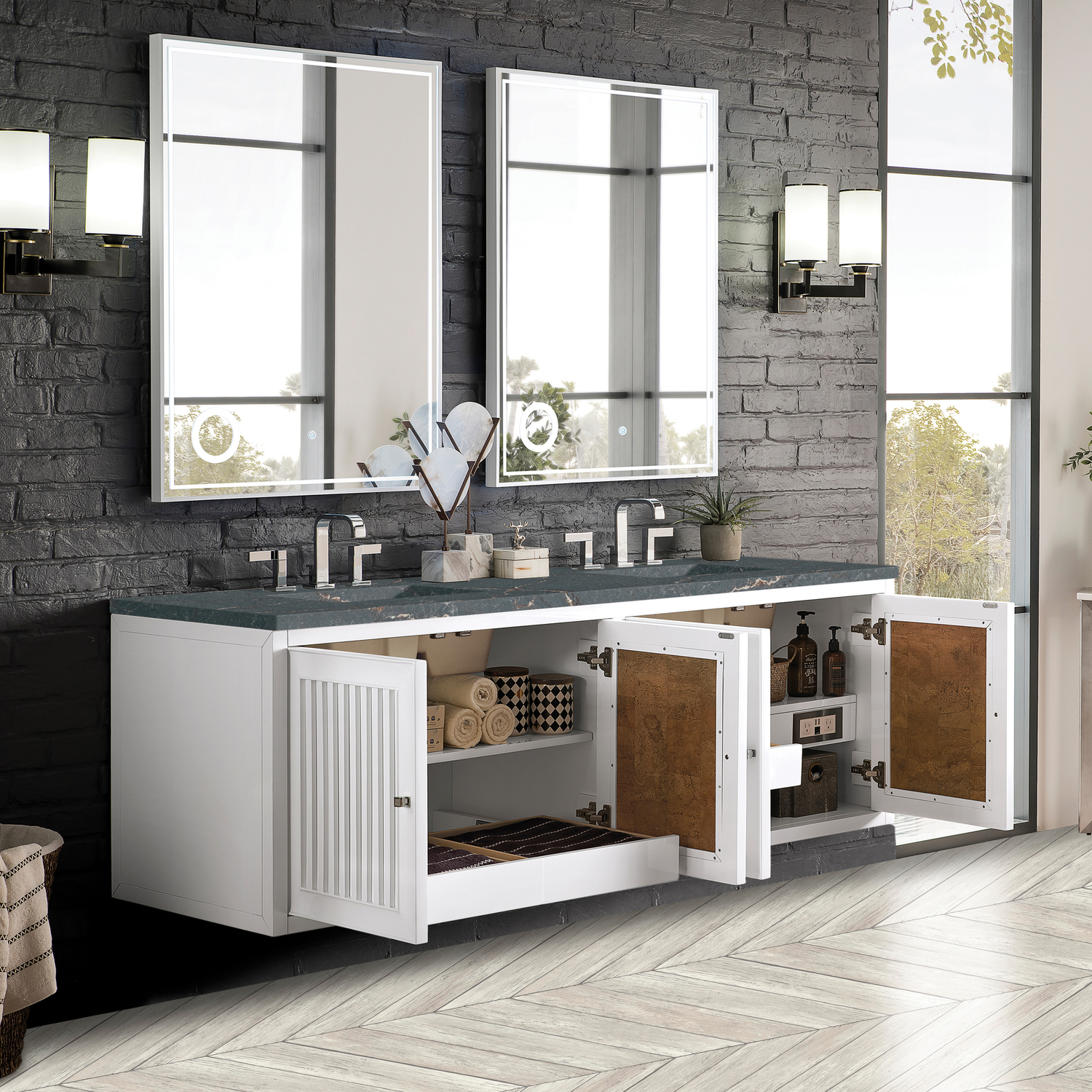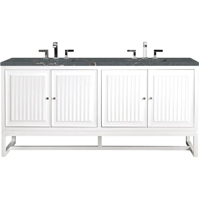 Customize your space with the Athens 72” Glossy White Double Vanity by James Martin Vanities. Part of the larger Athens modular collection, this incredible Vanity boasts an impressive amount of storage space and combines traditional charm with modern functionality. Premium standard features include soft-close undermount drawer glides and adjustable door hinges, brushed aluminum laminate drawer bottoms, and one bamboo drawer organizer. The Bright White finish is enhanced by the Parisien Bleu Silestone top, offering a deep bluish hue with broad and intricate neutral veins highlighted by fine coppery accents.Vanity set includes a 3cm eased edge Parisien Bleu Silestone top, which includes two white porcelain rectangular undermount sinks that ship separately, as well as mounting brackets for easy installation. The top is pre-drilled for two 8" widespread faucetFour door Glossy White double vanity with three interior drawers and shelf spaceCrafted from Poplar solids and plywood and is sealed inside and outside with our premium moisture and UV resistant coatingDrawer boxes are constructed using English Dovetail joinery, feature soft-close undermount glides and a Brushed Aluminum laminate drawer bottom.Polished Chrome hardwareIncludes one removable Bamboo drawer organizer trayThis cabinet may be installed with the wood base as a free standing vanity or mounted to the wall as a floating vanity. All mounting hardware is included.Includes a 120 UL-rated electrical component with dual power outlets and USB (Type A) portsFaucets sold separatelyCountertop is pre-drilled for two 3-hole 8" spreadsMake an elegant focal point in your bathroom with the Athens Collection by James Martin Vanities. This durably crafted solid wood collection features tons of roomy storage options behind its sleek modern design. Constructed by expert craftsmen, this collection incorporates a wide variety of different pieces to address your every need. Its beautiful raised panel doors come with vertical grooved opening that allows you to either have it’s normal elegant acacia paneling showing through or if you want reverse it and show off the unique cork look in between those grooves giving you a more transitional look. This unique modular vanity collection is comprised of several different size vanities, mirrors, drawer units, tables and cabinets constructed from solid poplar hardwood and completed in either a mid-century acacia or glossy white finish. These pieces can be topped by any one of our eight custom tops giving that perfect look you been looking for. Soft closing doors and drawers provide smooth and quiet operations, while burnished bronzed finished metal hardware provides the perfect finishing touch. Other fine details include white Ceramic sinks with overflow, dovetail joint drawer construction, predrilled holes to accommodate 8 in. widespread faucets, and multi-layer finish on the cabinets provide beauty and durability for years to come.1 year warranty against manufacturer's defects. We will repair or replace any defective product, if the product is defective in material or workmanship at our discretion. No warranty is expressed or implied regarding damages resulting from consumer misuse.