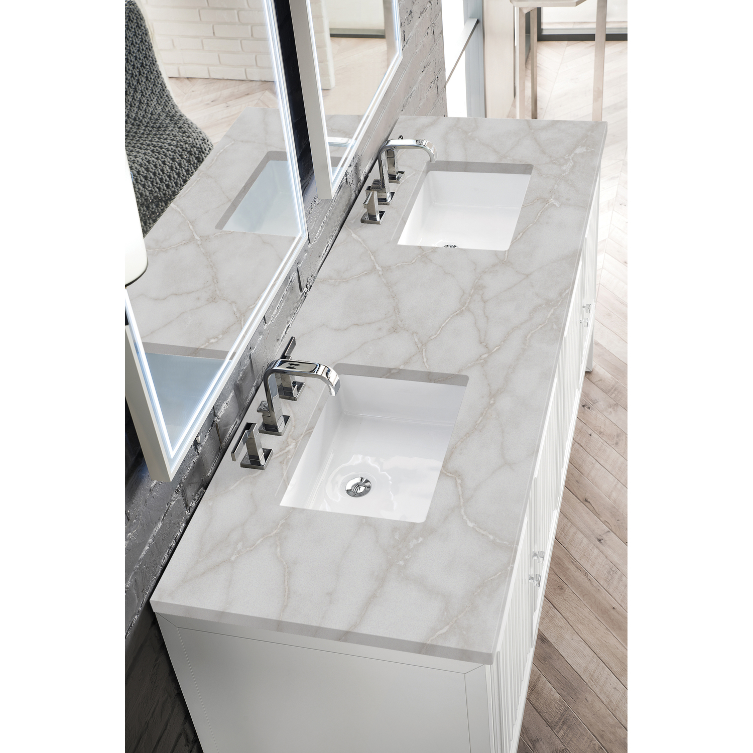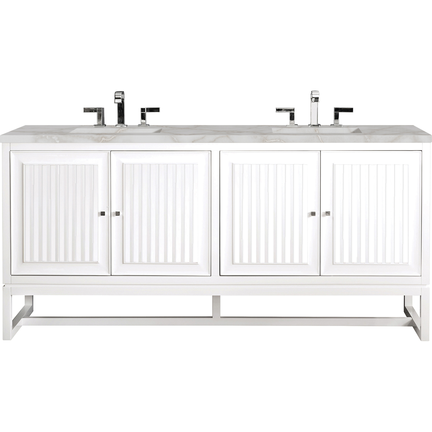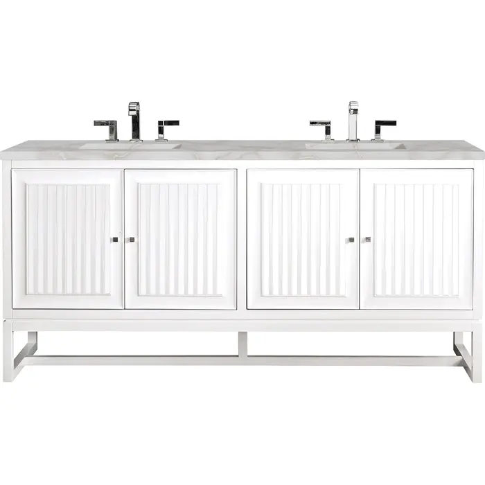 Customize your space with the Athens 72” Glossy White Double Vanity by James Martin Vanities. Part of the larger Athens modular collection, this incredible Vanity boasts an impressive amount of storage space and combines traditional charm with modern functionality. Premium standard features include soft-close undermount drawer glides and adjustable door hinges, brushed aluminum laminate drawer bottoms, and one bamboo drawer organizer. The Bright White finish is accented by the neutral background of the Victorian Silver Silestone top, boasting champagne metallic accents which seamlessly complement wood tones.Vanity set includes a 3cm eased edge Victorian Silver Silestone top, two white porcelain rectangular sinks and mounting brackets for easy installation. Top is pre-drilled for two 8" widespread faucets. Faucets not included.Four door Glossy White double vanity with three interior drawers and shelf spaceCrafted from Poplar solids and plywood and is sealed inside and outside with our premium moisture and UV resistant coatingDrawer boxes are constructed using English Dovetail joinery, feature soft-close undermount glides and a Brushed Aluminum laminate drawer bottom.Polished Chrome hardwareIncludes one removable Bamboo drawer organizer trayThis cabinet may be installed with the wood base as a free standing vanity or mounted to the wall as a floating vanity. All mounting hardware is included.Includes a 120 UL-rated electrical component with dual power outlets and USB (Type A) portsFaucets sold separatelyCountertop is pre-drilled for two 3-hole 8" spreadsMake an elegant focal point in your bathroom with the Athens Collection by James Martin Vanities. This durably crafted solid wood collection features tons of roomy storage options behind its sleek modern design. Constructed by expert craftsmen, this collection incorporates a wide variety of different pieces to address your every need. Its beautiful raised panel doors come with vertical grooved opening that allows you to either have it’s normal elegant acacia paneling showing through or if you want reverse it and show off the unique cork look in between those grooves giving you a more transitional look. This unique modular vanity collection is comprised of several different size vanities, mirrors, drawer units, tables and cabinets constructed from solid poplar hardwood and completed in either a mid-century acacia or glossy white finish. These pieces can be topped by any one of our eight custom tops giving that perfect look you been looking for. Soft closing doors and drawers provide smooth and quiet operations, while burnished bronzed finished metal hardware provides the perfect finishing touch. Other fine details include white Ceramic sinks with overflow, dovetail joint drawer construction, predrilled holes to accommodate 8 in. widespread faucets, and multi-layer finish on the cabinets provide beauty and durability for years to come.1 year warranty against manufacturer's defects. We will repair or replace any defective product, if the product is defective in material or workmanship at our discretion. No warranty is expressed or implied regarding damages resulting from consumer misuse.