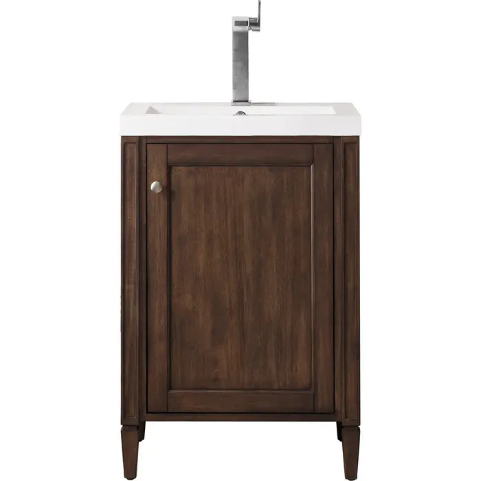The streamlined structure of the Britannia 24" Single Vanity by James Martin Vanities has a visually elegant appearance. This beautiful cabinet is constructed with poplar solids and veneers featuring a Mid-Century Acacia finish, and the gorgeous White Glossy Composite Stone top is durable enough to handle daily usage. It has one full size door that conceals a spacious storage area. Small and demure, this vanity has an uncomplicated silhouette that will bring a quiet elegance to any bathroom.One door Mid-Century Acacia single vanity with interior shelf spaceHardware Finish: Satin NickelSolid kiln-dried Grade A hardwoodCabinet is finished inside and out with a premium undercoat finish for superior moisture and UV resistanceSoft-close door hingesMid-Century Acacia Composite Stone integrated top and sink includedCountertop is pre-drilled for one single hole faucetFaucet sold separatelyThe Britannia Collection by James Martin Vanities is the perfect vanity for the customer who likes traditional to transitional styling. This durable collection is constructed out of poplar solids and veneers that brings a warmth to your bathroom. Featuring a variety of different finishes, satin nickel hardware and elegant tapered legs gives this vanity a complete look. The glossy white composite top is durable, maintenance free and comes predrilled for easy installation. Cabinet doors include European concealed adjustable hinges that offer a sleek look and makes aligning the doors easy. All vanities made by James Martin are made to furniture industry standards that means each one has soft-close doors, vertical supports, and corner brackets for reinforced strength, dual adjustment hinges that allow for easy alignment, as well as a premium finish for superior moisture resistance.1 year warranty against manufacturer's defects. We will repair or replace any defective product, if the product is defective in material or workmanship at our discretion. No warranty is expressed or implied regarding damages resulting from consumer misuse.
