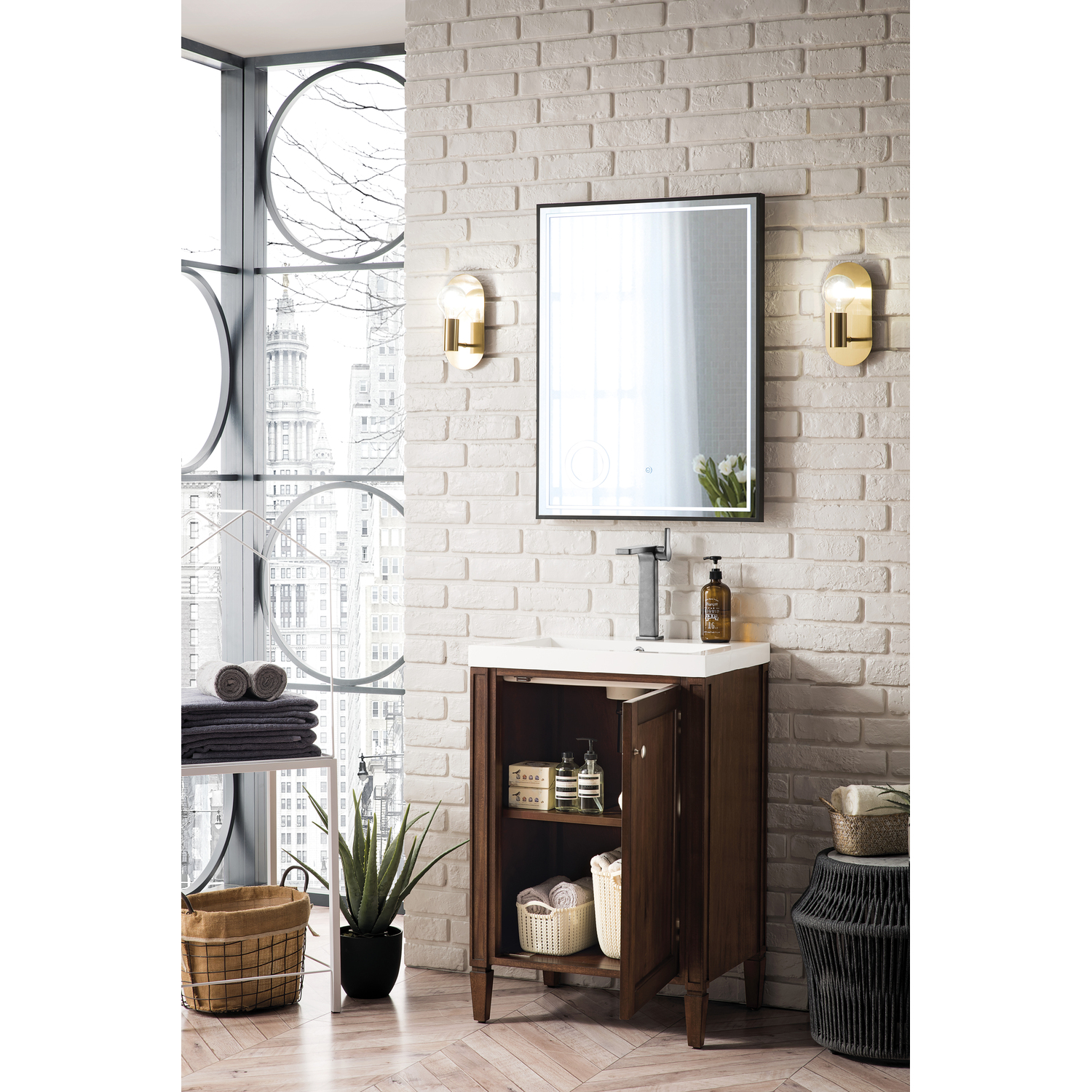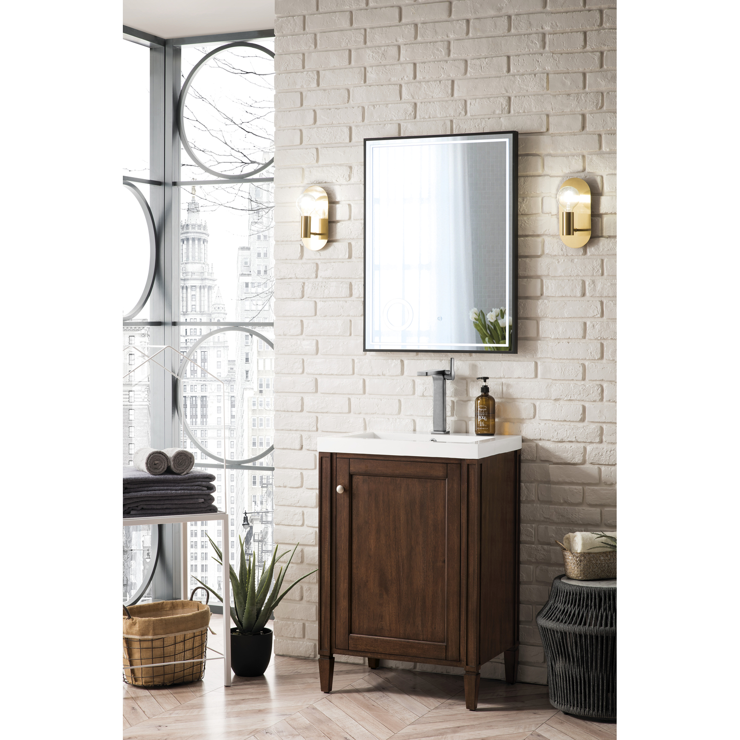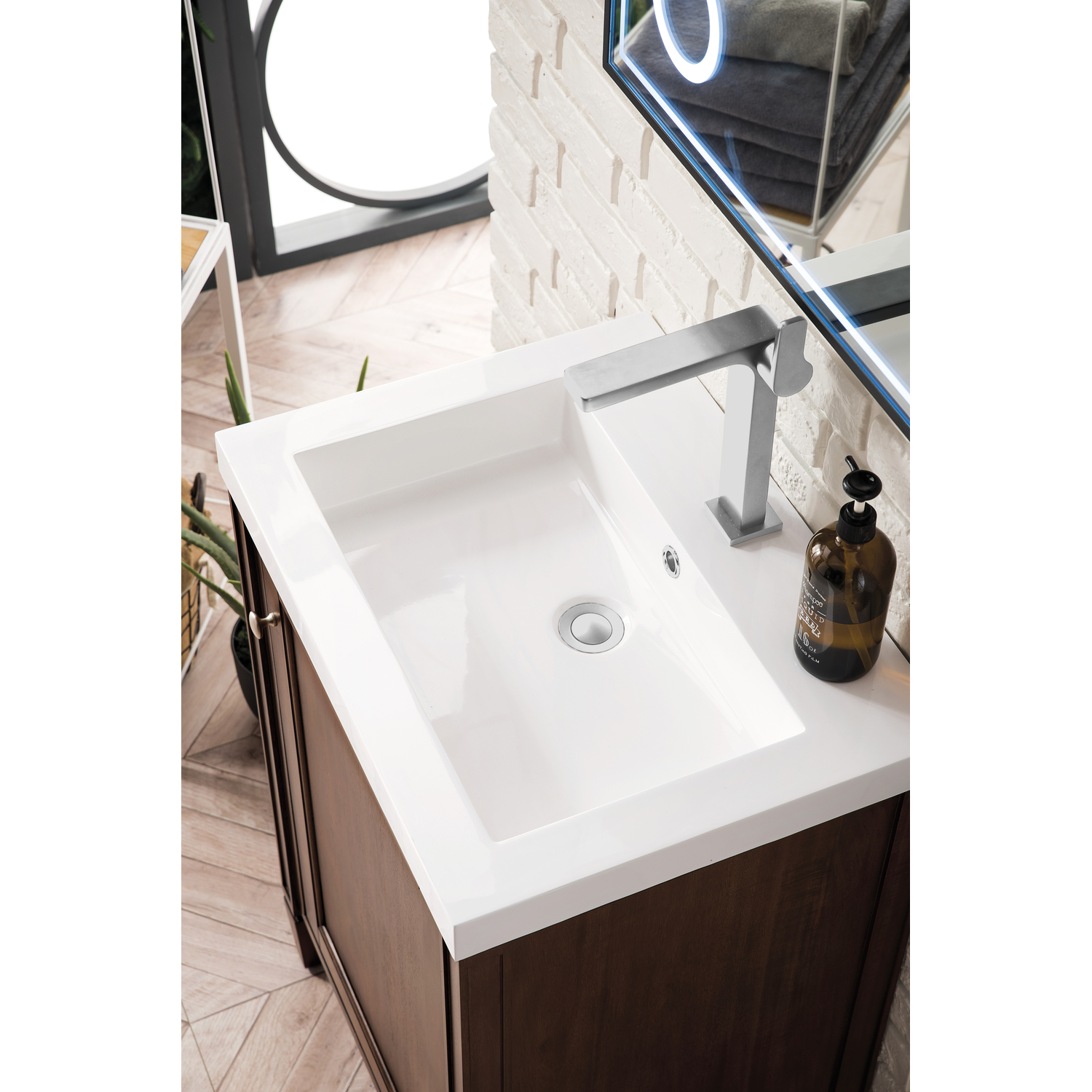 James Martin Britannia 24 inch Single Bathroom Vanity, Mid-Century Acacia w/ White Glossy Composite Stone Top E652V24MCAWG