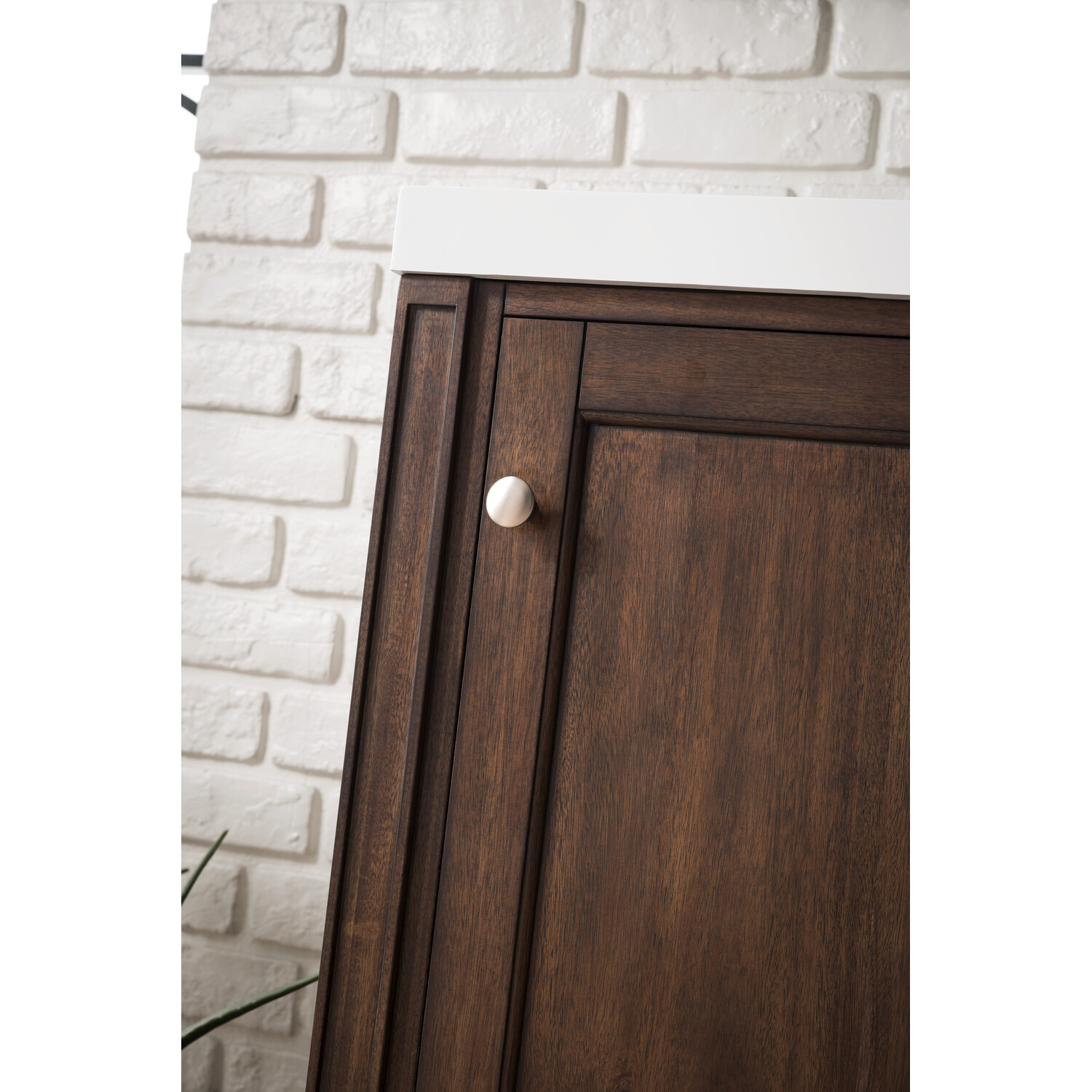 - The Britannia Collection by James Martin Vanities is the perfect vanity for the customer who likes traditional to transitional styling. This durable collection is constructed out of poplar solids and veneers that brings a warmth to your bathroom. Featuring a variety of different finishes, satin nickel hardware and elegant tapered legs gives this vanity a complete look. The glossy white composite top is durable, maintenance free and comes predrilled for easy installation. Cabinet doors include European concealed adjustable hinges that offer a sleek look and makes aligning the doors easy. All vanities made by James Martin are made to furniture industry standards that means each one has soft-close doors, vertical supports, and corner brackets for reinforced strength, dual adjustment hinges that allow for easy alignment, as well as a premium finish for superior moisture resistance.