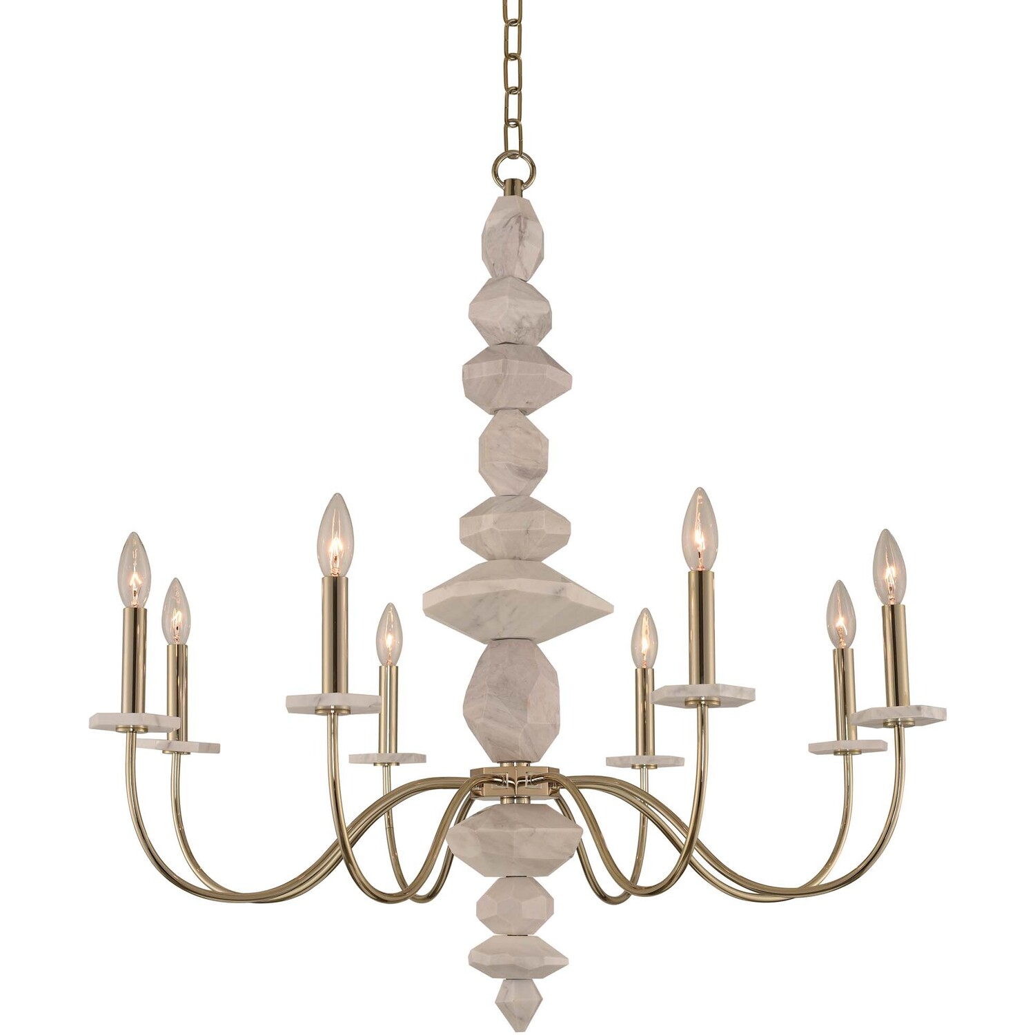 Minimalist meets Organic Design with the Carrara Collections natural cut authentic white marble, heavy gauge steel construction and Champagne Gold Finish.8 Light ChandelierE12 Candelabra
