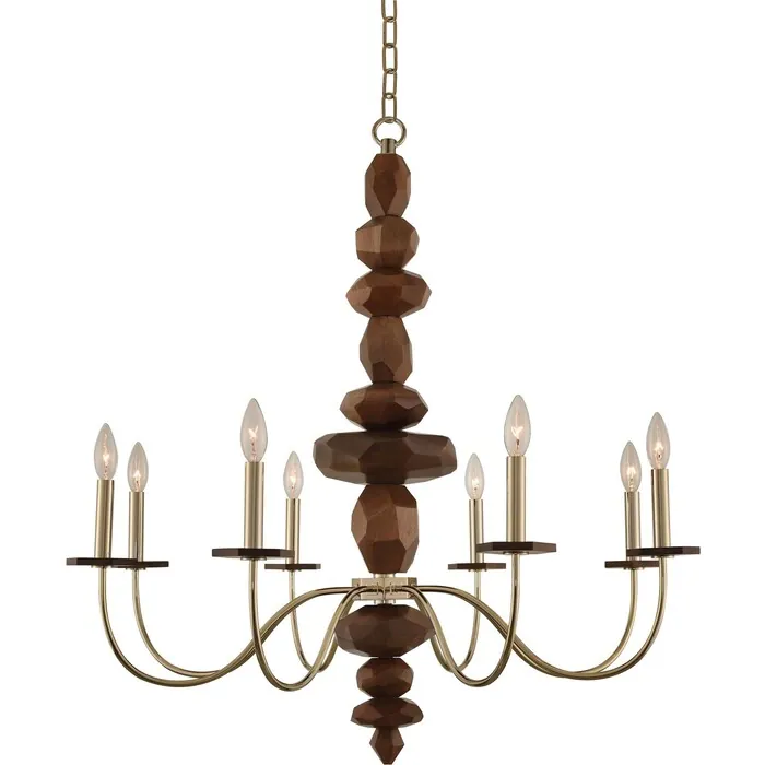 The Lassen collection boast organic shapes that make this truly stunning series. Featured in a champagne gold finish with natural cut wood column and bobeches.8 Light ChandelierE12 Candelabra