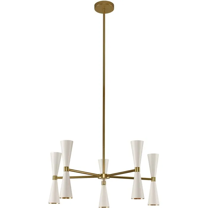 Trendy Mid-Century inspired design with dual LED lamping for maximum efficiency. The MILO Collection features a variety of configurations to fit every space, from sconce and entry to dining. Introduced in June of 2016 in a sleek Matte Black with Vintage Brass accents, Kalco has added a Warm White finish, also featuring vintage brass accents.5 Arm ChandelierG9 LED
