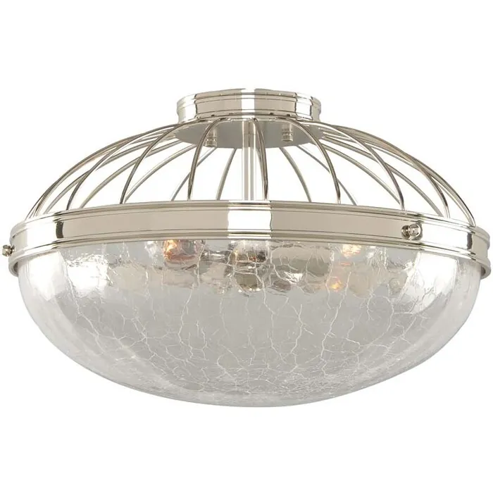 A fresh take on a classic style. These pendants and semi-flush fixtures feature beautifully crafted bands and wire guards that cradle the Hand Blown Crackle Glass. Finish is a high luster Polished Nickel Finish.16" Flush MountE26 Medium