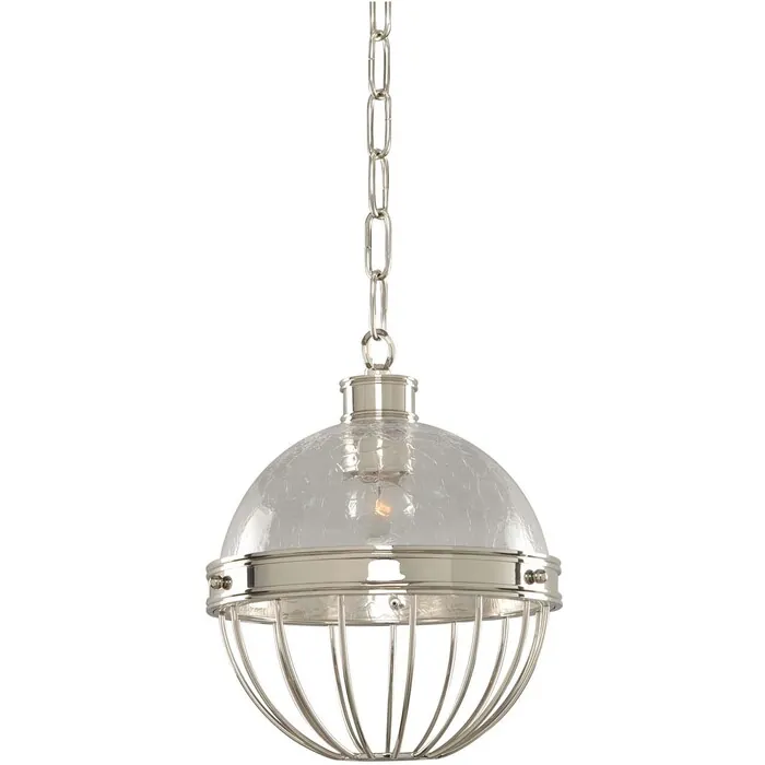A fresh take on a classic style. These pendants and semi-flush fixtures feature beautifully crafted bands and wire guards that cradle the Hand Blown Crackle Glass. Finish is a high luster Polished Nickel Finish.9" PendantE26 Medium