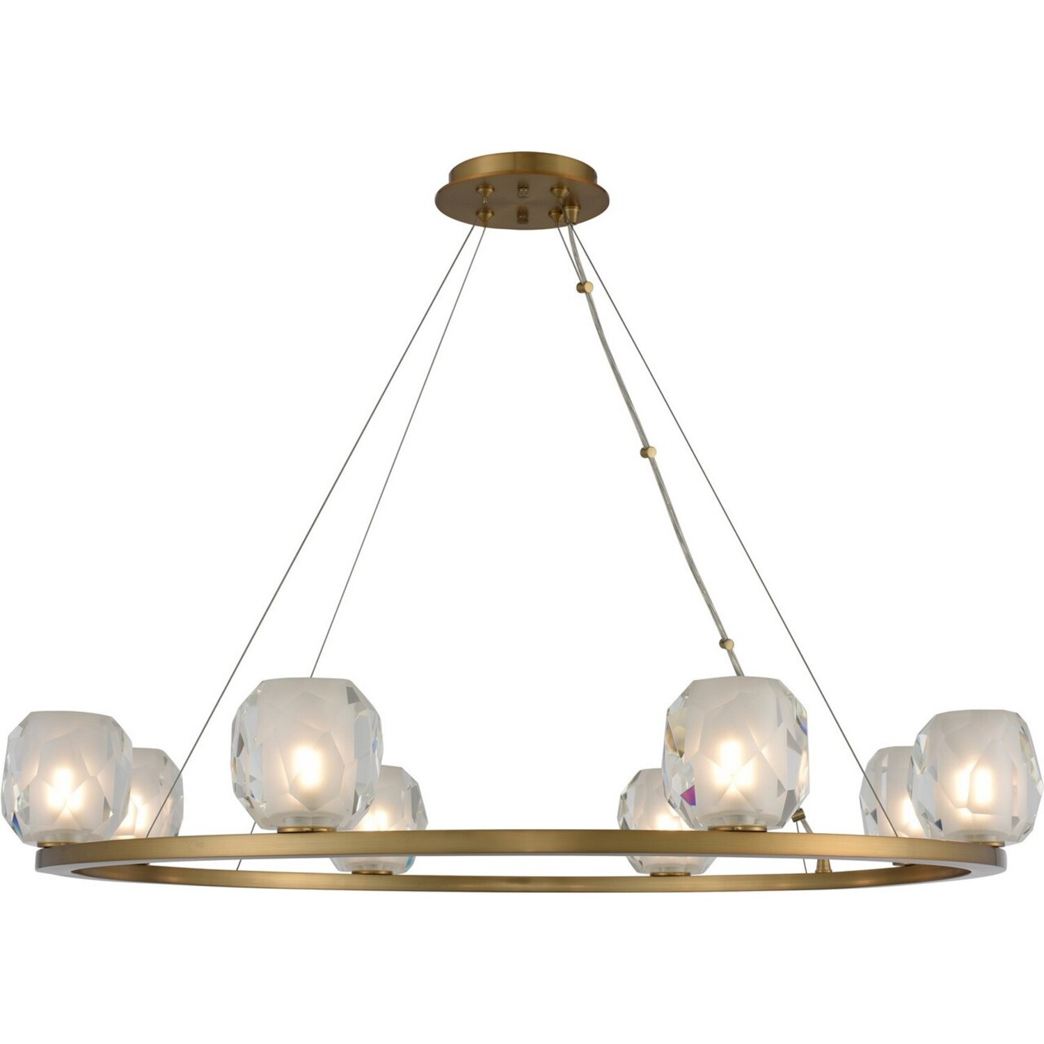 Jewel Cut Frosted Glass rests on a simple steel constructed form in a warm Winter Brass finish. LED G9 bulbs included.8 Light PendantG9 LED