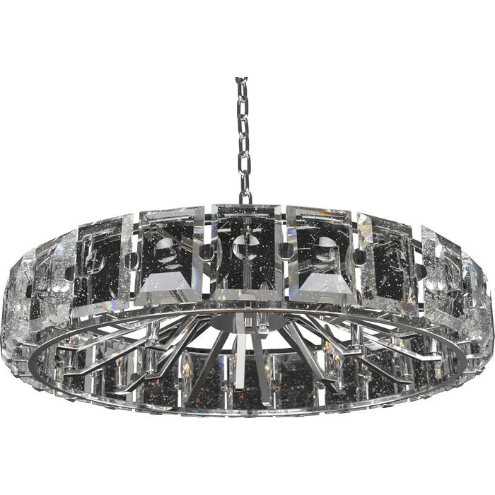 The appeal of the Giada is its double beveled clear bubble crystal panels. The Polished Chrome or Dark Bronze finish lets this jewel shine in any room. Whether trying for a vintage redesign of your home or updating to a more modern look, the Giada Collection from Kalco Lighting presents you with many opportunities. Try it in the bedroom for a dramatic effect or add a splash of elegance with a pendant over the dining room table. Soft light reflects off crystal panels for a dazzling style to set the tone of the room.39" PendantE12 Candelabra