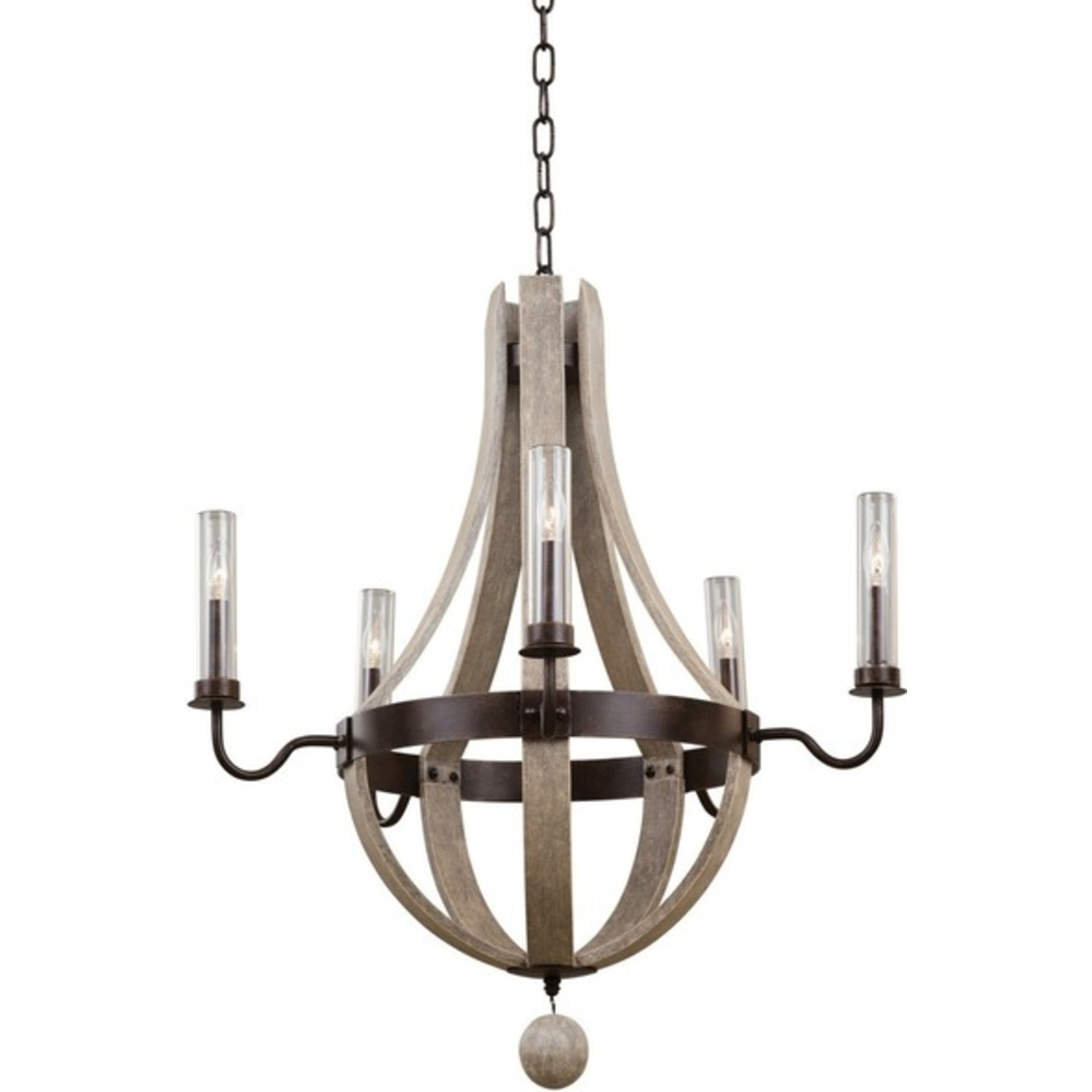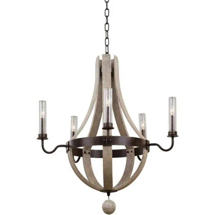 The Coastal inspired Harper Collection now extends to outdoor living spaces. Featuring threaded glass covers for protection from the elements, heavy gauge aluminum construction, stainless steel parts and chains with a simple Florence Gold finish and hand painted driftwood accents.5 Light Outdoor ChandelierE12 Candelabra