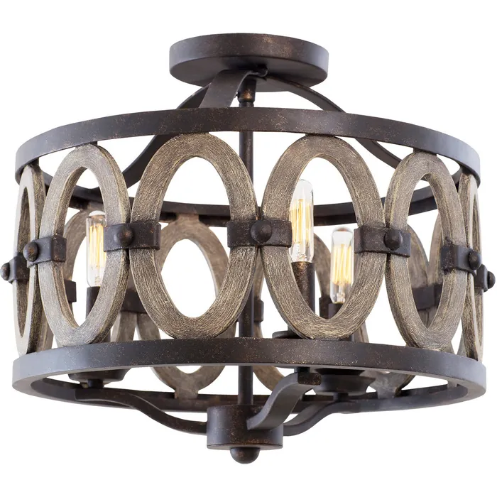 As a sconce, flush mount or foyer center piece, the wrought iron paired with the painted drift wood accents of the Belmont line allows for style in any situation. Charming drift wood painted ovals and sturdy, hand-forged wrought iron come together for an intriguing juxtaposition of materials and colors. A perfect accent for any room, the intricate detail of the drift wood finish will enrich your home decor. Robust, rustic and rich in elegance,the Belmont suits all decoration styles.16.5" Flush MountE12 Candelabra