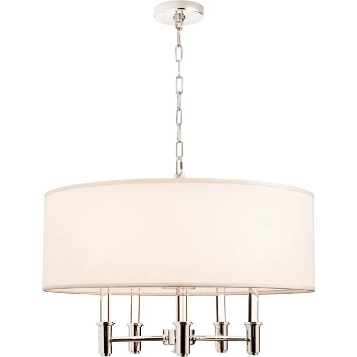 The Dupont Collection is offered in a Polished Chrome finish with Off-White Silk shades, a bottom diffuser and Optic Crystal Accents.5 Light Round PendantE12 Candelabra