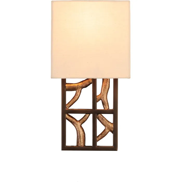 The Hudson Collection features a Nature Inspired theme in Hand Forged Wrought Iron with an Antique Bronze finish and Antique Gold Accents. Beige Linen shade included.1 Light Wall SconceE12 Candelabra