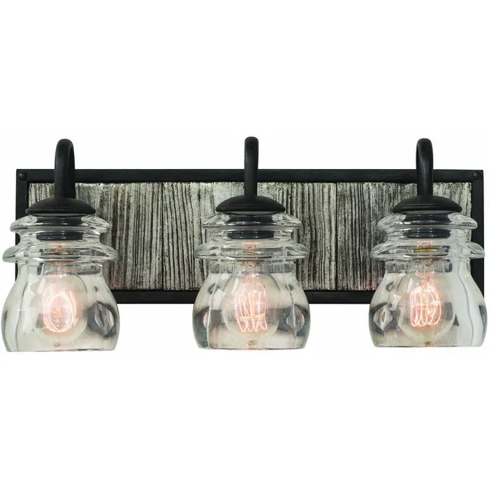 Bainbridge features Black Iron finish with a Burnt Silver Wood Backplate. Constructed of Hand Forged Wrought Iron with Clear Insulator Glass.3 Light BathE26 Medium