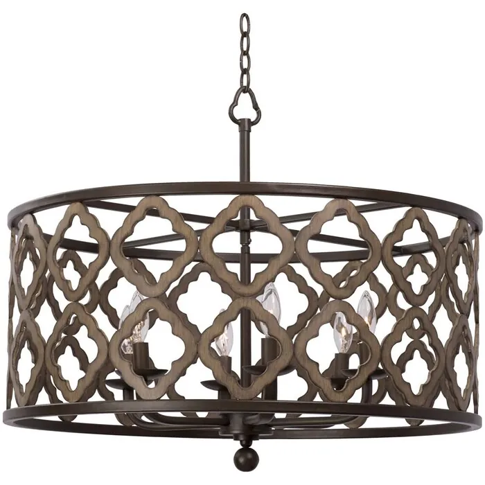 Whittaker is constructed of Hand Forged Wrought Iron with a Brownstone Finish and Painted Weathered Wood Accents. Featuring an Open Cage Design with Scalloped Edge Framing.6 Light PendantE12 Candelabra
