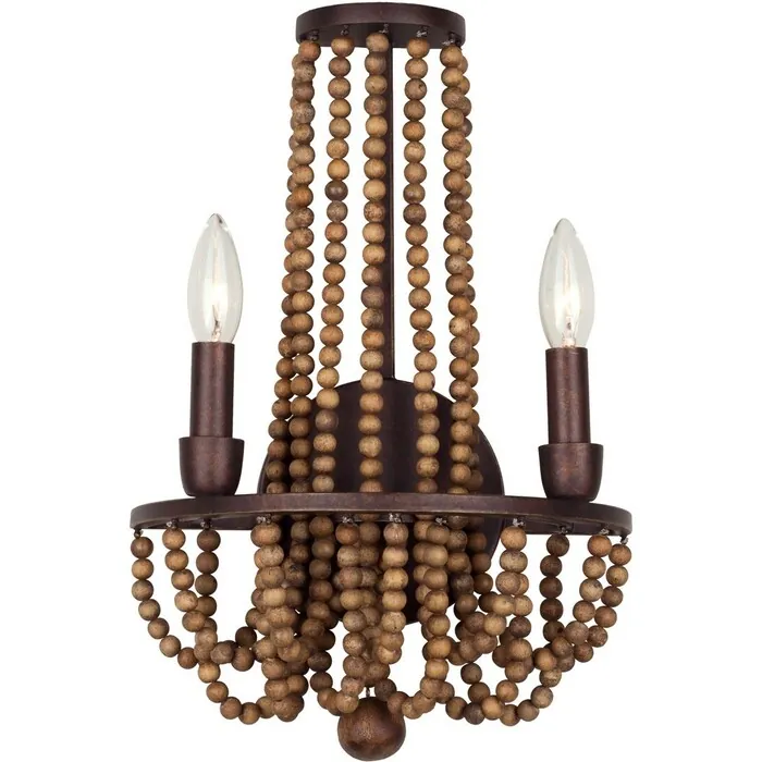 Authentic Gmelina Wood beads cascade a simple Royal Mahogany Wrought Iron Frame to create the perfect coastal compliment.2 Light Wall BracketE12 Candelabra