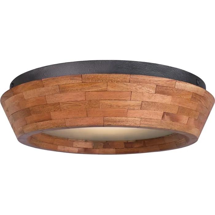 This urban farmhouse inspired design features natural wood inlay and hand painted wrought iron accents. Available in multi-tier hanging, flush and wall pieces.14" LED Flush MountLED