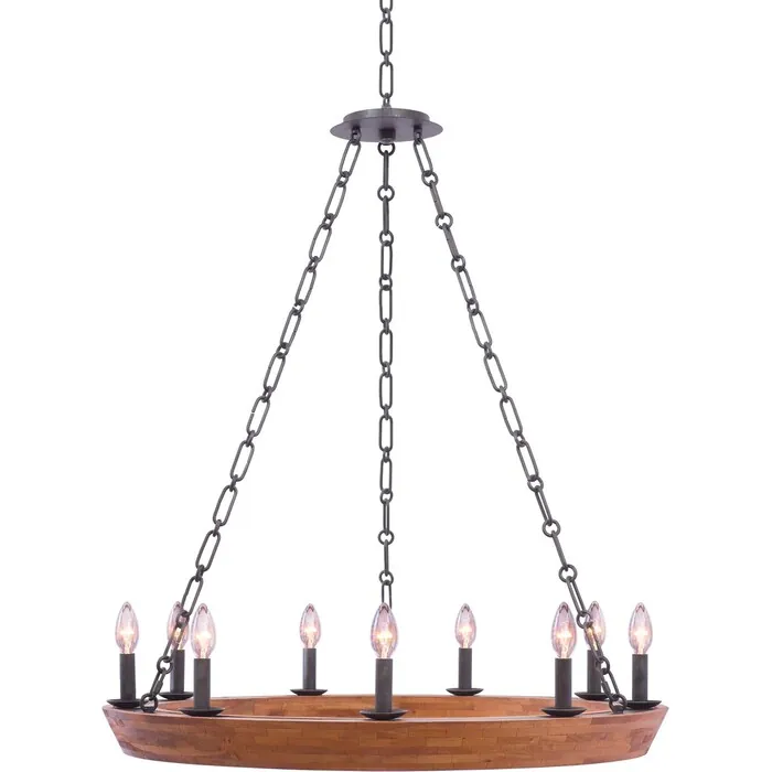 This urban farmhouse inspired design features natural wood inlay and hand painted wrought iron accents. Available in multi-tier hanging, flush and wall pieces.9 Light ChandelierE12 Candelabra