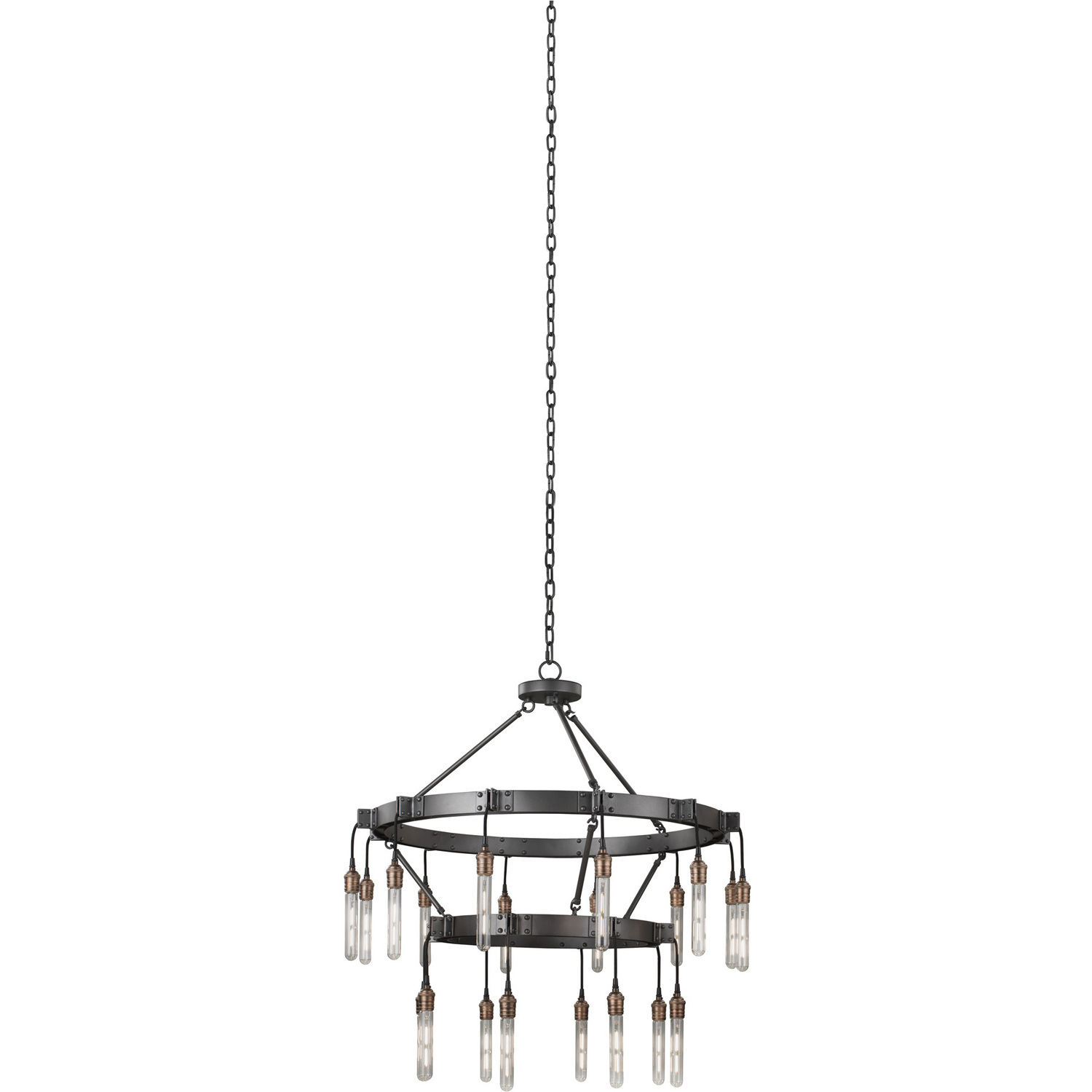 City loft inspired design, featuring heavy gauge steel construction and rivet detail hardware with solid brass patina sockets in a classic industrial Matte Gun Metal finish.8+12 Light 2 Tier ChandelierE26 Medium
