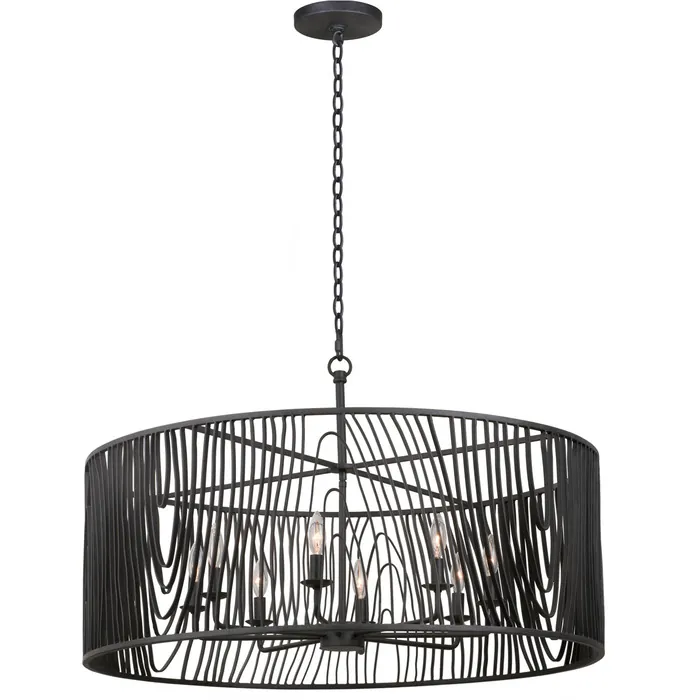 Inspired by Moire patterns found in French textiles, this visual tongue twister features carefully crafted, heavy gauge steel construction and a simple Black Iron finish.36" PendantE12 Candelabra