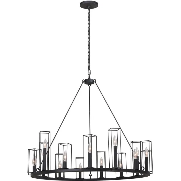 Clean geometric forms frame warm candlelight creating a landscape fit for any living space. Featuring a Black Iron finish and simple steel construction.15 Light ChandelierE12 Candelabra
