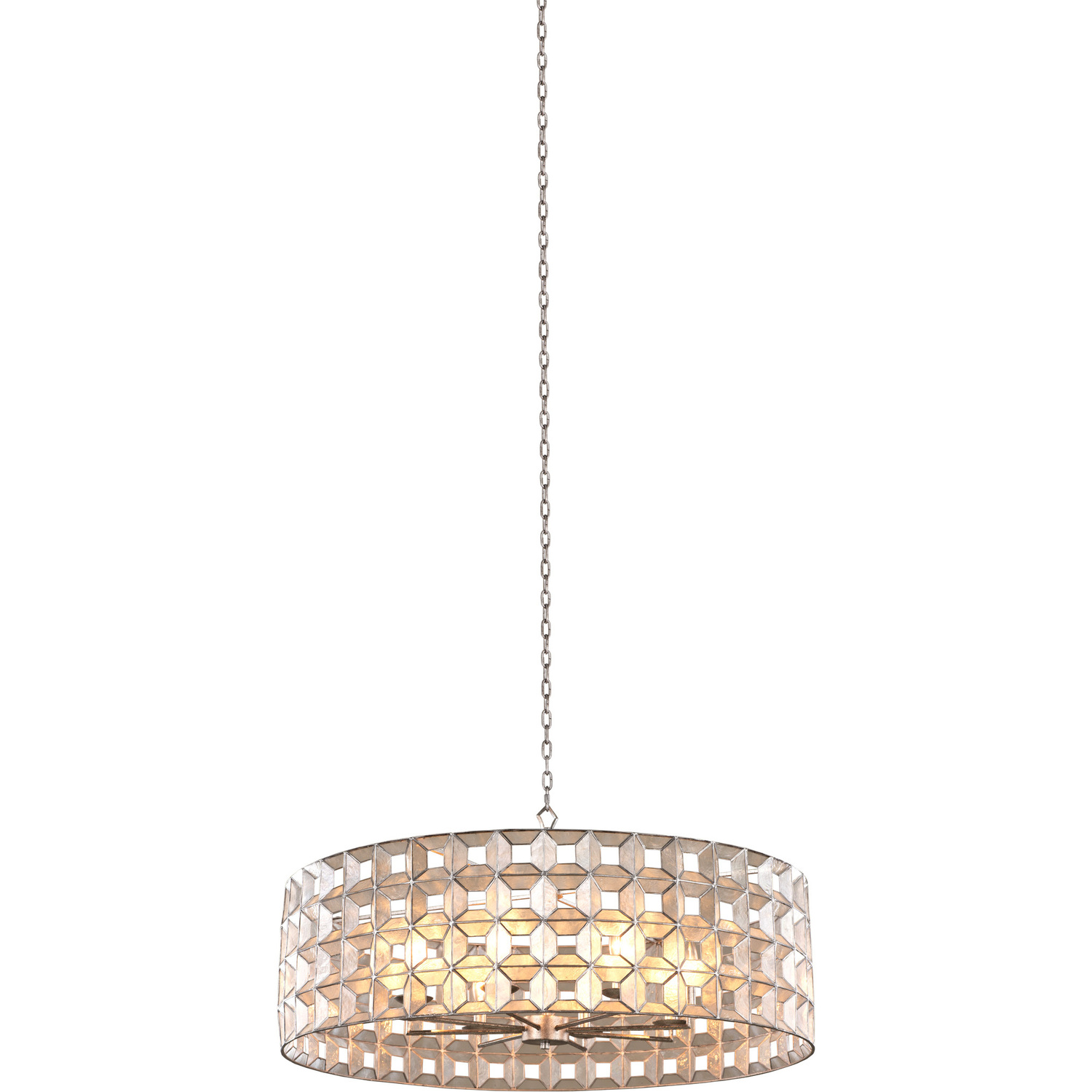 Inspired by the patterns found in Rome's Parthenon, the Prado Collection marries natural Capiz Shell with architectural design. Featuring a handcrafted open frame and cool Oxidized Silver Leaf finish.33" PendantE12 Candelabra