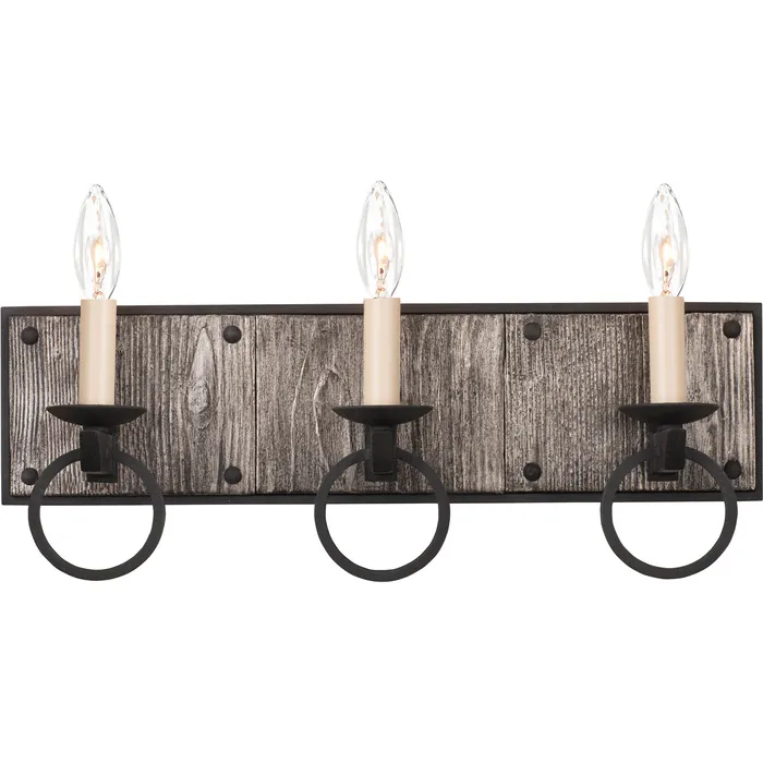Modern Farmhouse inspired design with Black Iron ring and rivet hardware detail and finish featuring Burnt Silver Wood accents.3 Light ADA BathE12 Candelabra