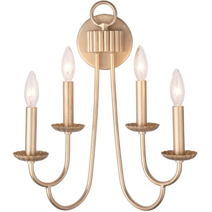 Contemporary inspired design meets old Hollywood Glamour with steel aluminum construction, soft ribbing and loop hardware detail, dipped extruded arms in a warm Modern Gold finish.4 Light Wall SconceE12 Candelabra