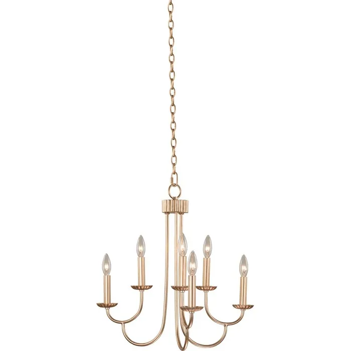 Contemporary inspired design meets old Hollywood Glamour with steel aluminum construction, soft ribbing and loop hardware detail, dipped extruded arms in a warm Modern Gold finish.(3 + 3) Light 2 Tier ChandelierE12 Candelabra