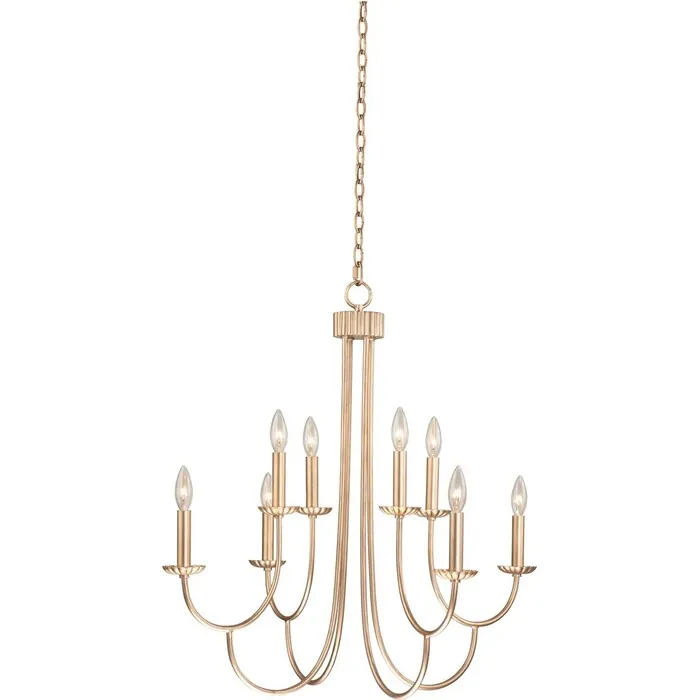 Contemporary inspired design meets old Hollywood Glamour with steel aluminum construction, soft ribbing and loop hardware detail, dipped extruded arms in a warm Modern Gold finish.(4 + 4) Light 2 Tier ChandelierE12 Candelabra