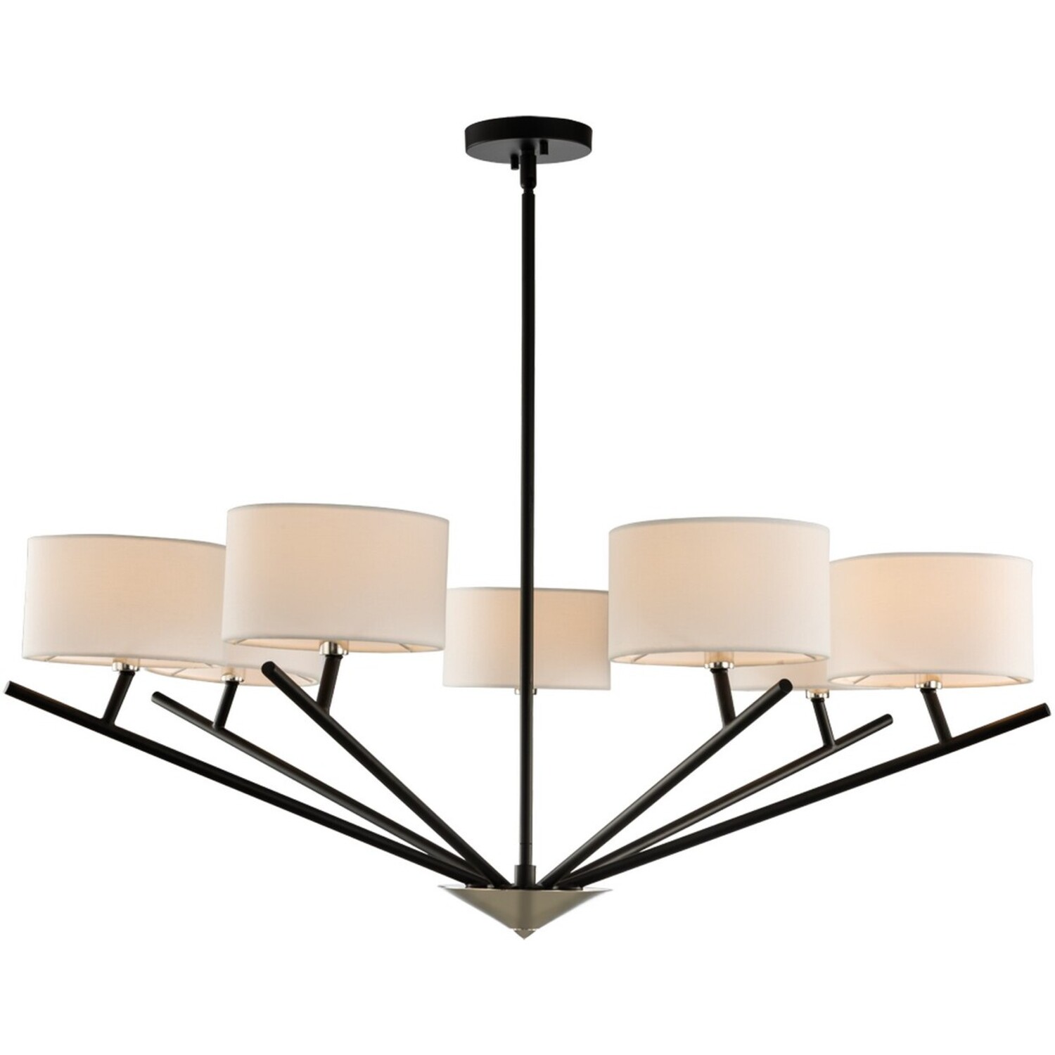 Kalco’s Tahoe Collection takes the best of Mid-Century Modern elements and marries those to more contemporary styling to create a 5 or 7-light Chandelier and 10-inch Wall Sconce that would be comfortable in a variety of design schemes. Matte Black with Polished Nickel steel and fabric shades.7 Light ChandelierCandelabra