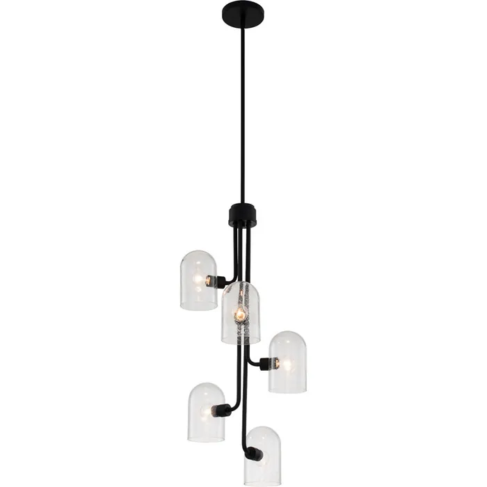 Matte Black and Bubble Glass combine in this understated yet sophisticated Cupola Collection. The unique elongated dome shades and soft industrial styling give an air of personality that's both modern and slightly edgy.5 Light Large FoyerE12 Candelabra (G16.5)