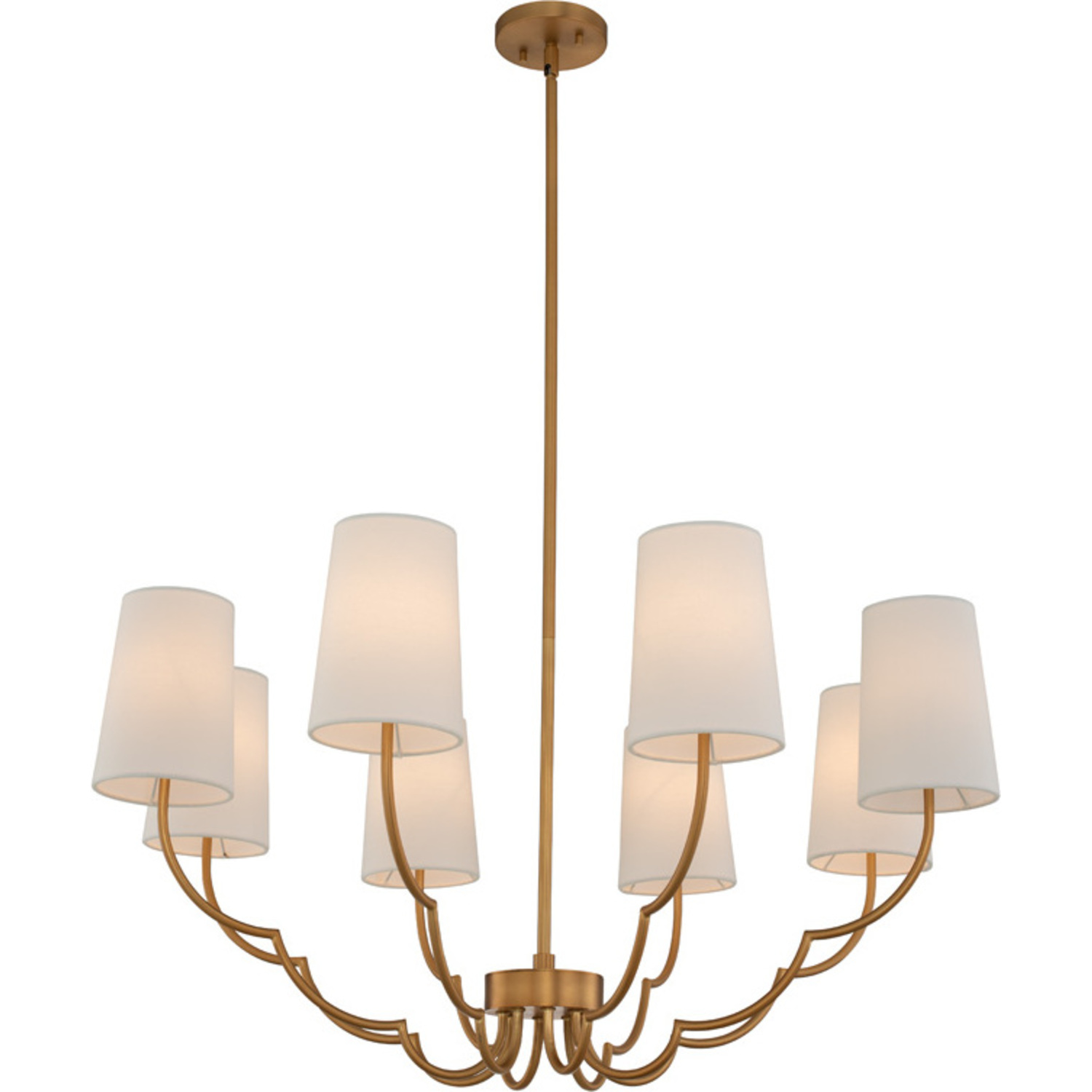 This Sophia Collection exudes feminine energy with its simple, scalloped silhouette. Available in a New Brass finish with White Linen Shades or Polished Nickel paired with Black Linen Shades. Perfect for transitional settings.8 Light ChandelierE12 Candelabra