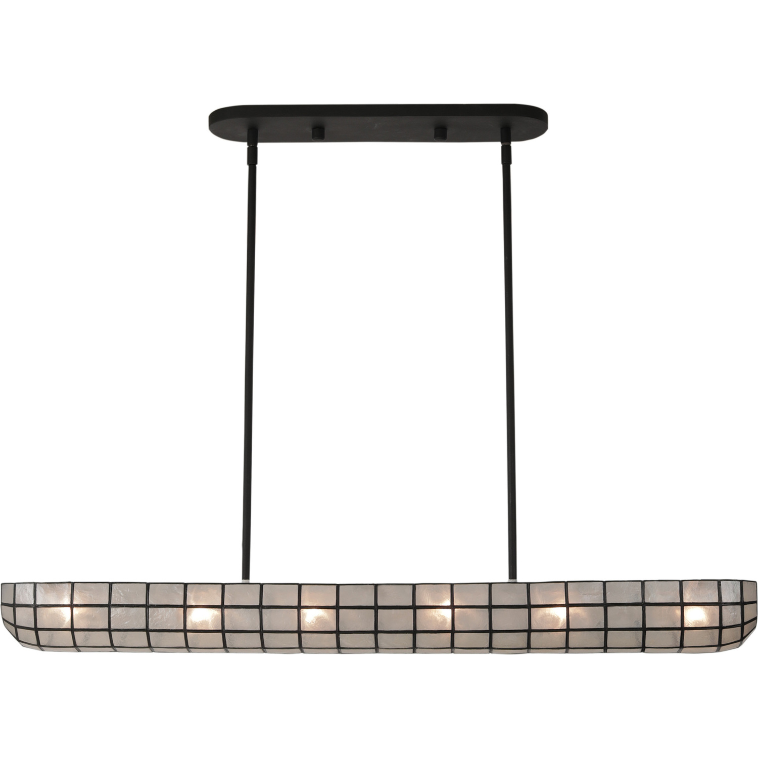 An updated take on a Tiff any-style look, the Sanibel collection encapsulates natural capiz shell in a modern matte black frame. The shells diffuse light to provide a soft, warm glow, and also create a beautiful organic ambiance when the fixture is off. Aircraft cables suspend the pendant from the ceiling for a finishing contemporary detail.44" IslandE12 Candelabra