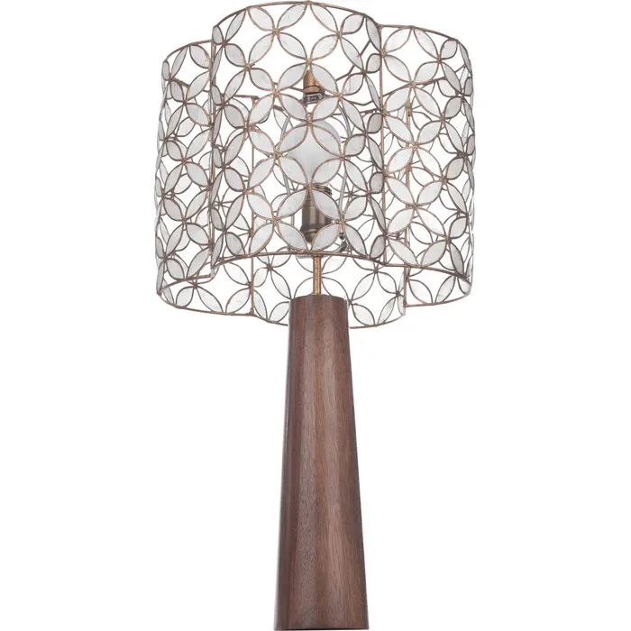 Warm up your interiors with the Maurelle collection, which pairs an Oxidized Gold Leaf finish with natural capiz shells for a statement that is both organic and feminine. The pattern of circles creates striking light play when illuminated, and its quatrefoil silhouette adds casual luxury to any space.1 Light Table LampE12 Candelabra