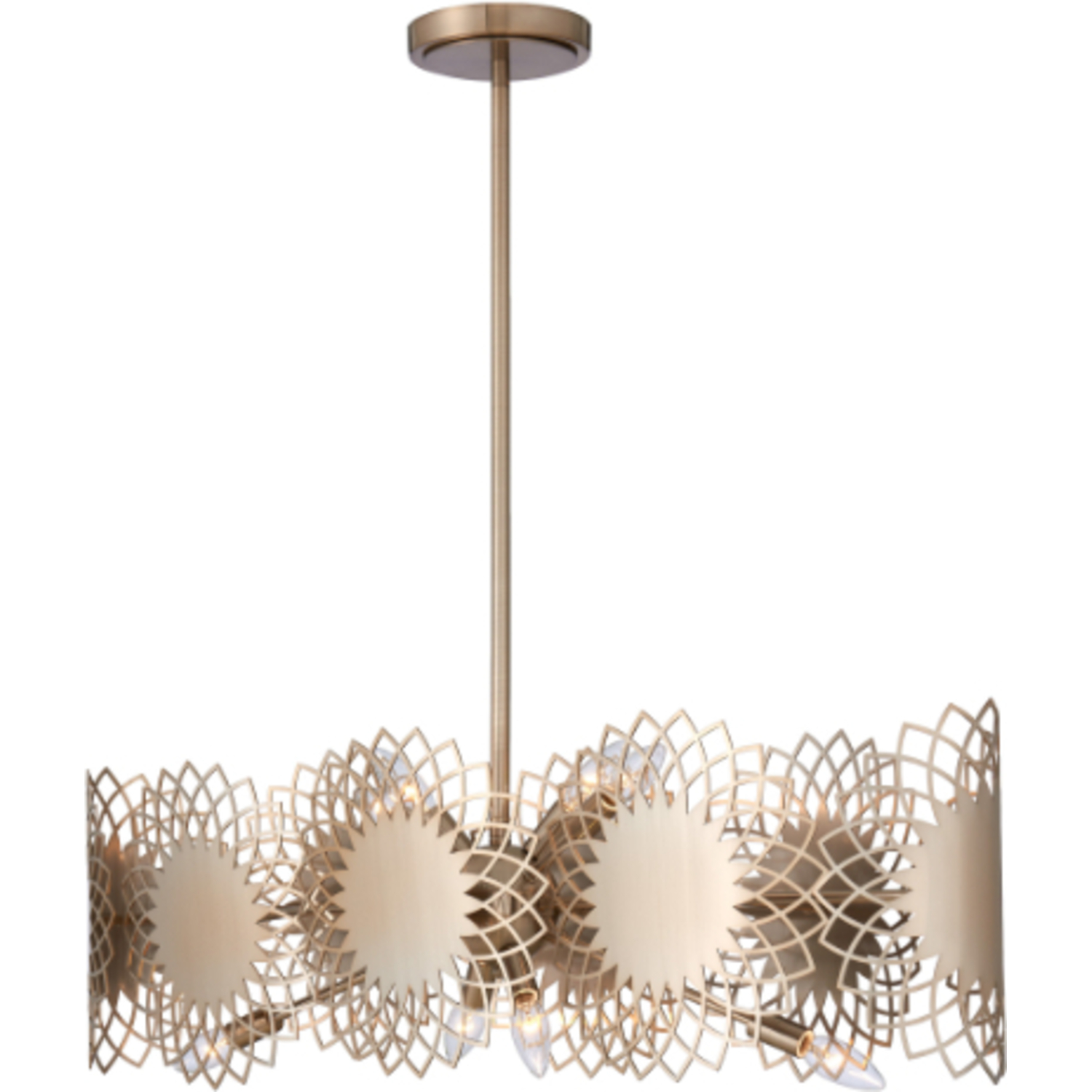 The Helia collection bursts in flower like shapes creating a whimsical design with a hint of Bohemian Flare. Featured in a Brushed Champagne Gold finish on a stainless steel, precision cut frame.38 In Island LightE12 Candelabra